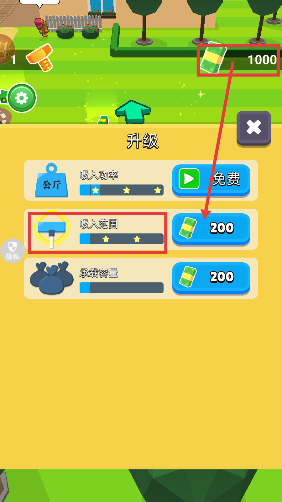 4、使用获得的金币,在升级界面提升【吸入范围】等属性,增强后续清理垃圾的效率。