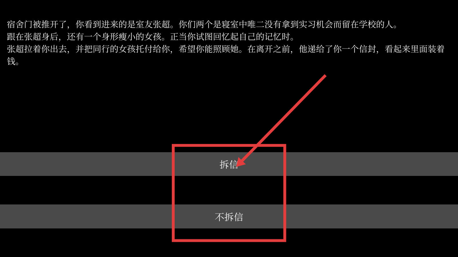 2、室友张超托付女孩并给信封后,选择【拆信】,获取后续行动需遵循的关键规则。
