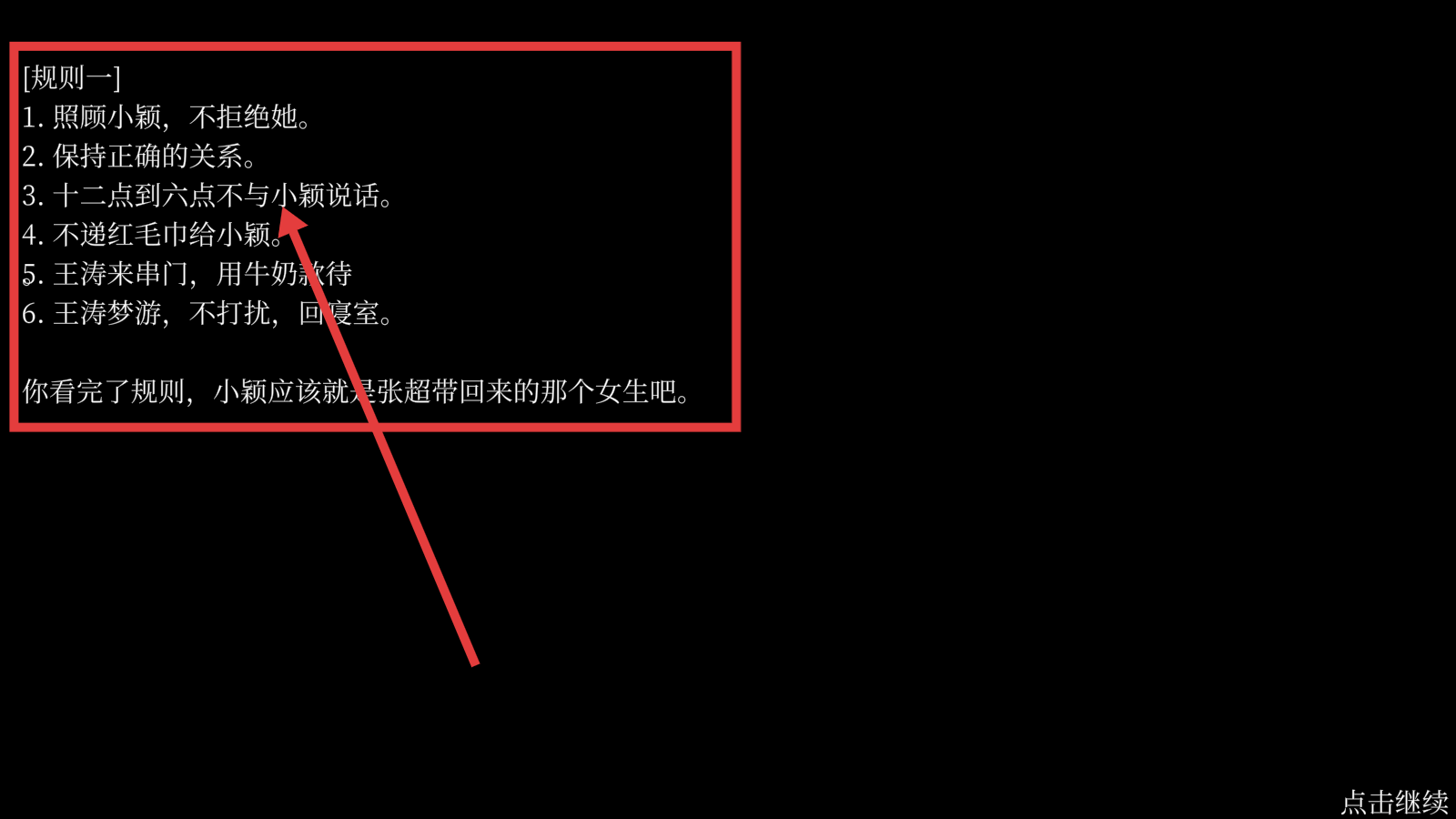 3、仔细牢记[规则一]的内容,如【照顾小颖-不拒绝她】【十二点到六点不与小颖说话】等,严格按规则行动以推进剧情。