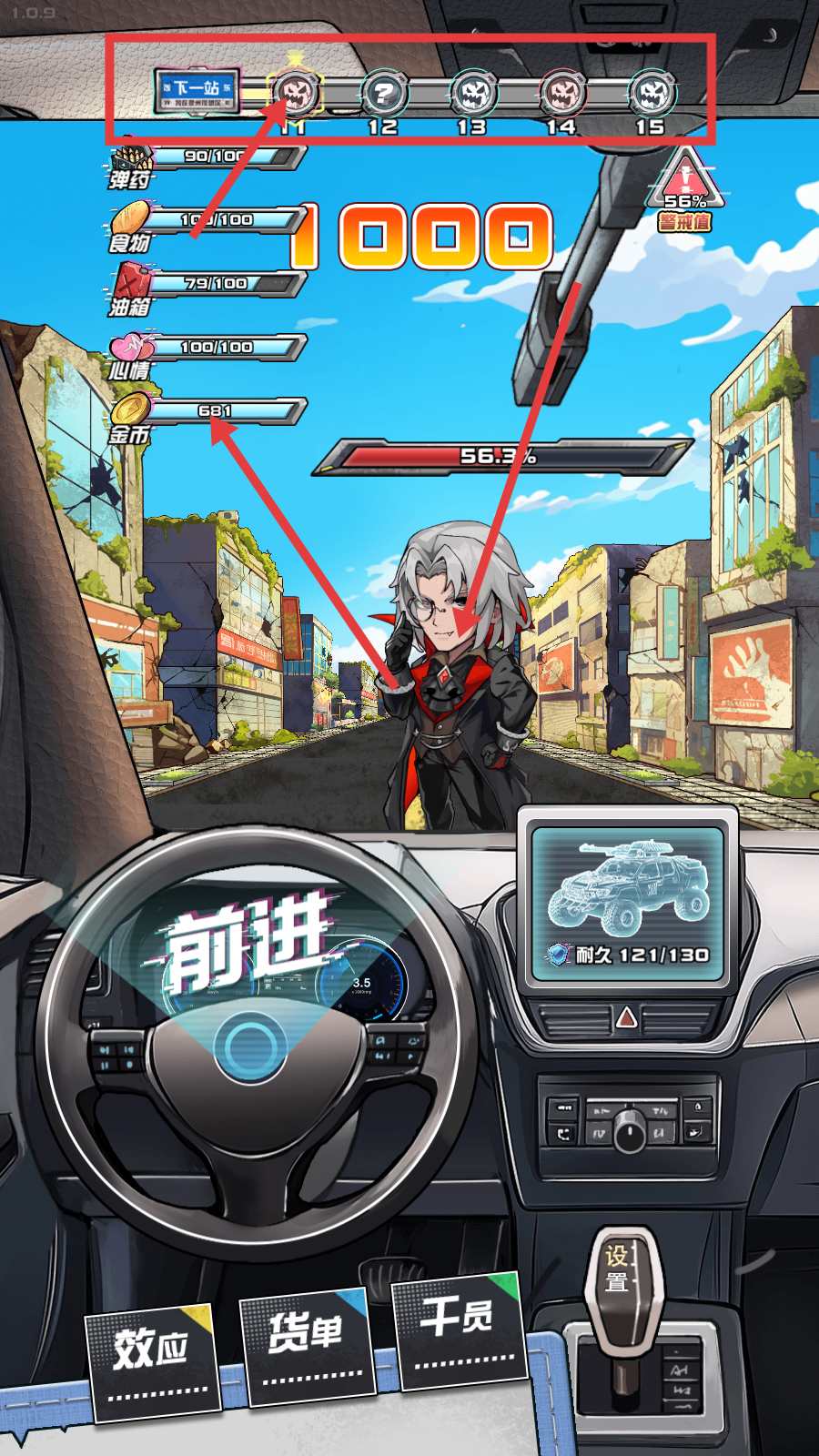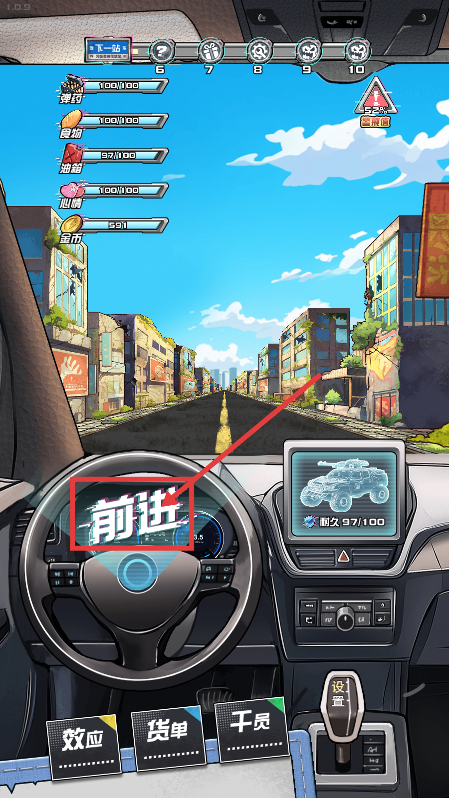 1、点击【前进】按钮开启行程,出发前留意【弹药-100/100】【食材-100/100】【油箱-97/100】等资源与车辆耐久,为行程做好准备。