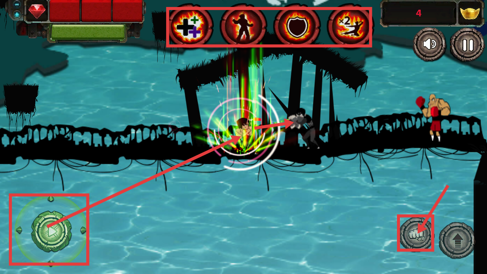 2、战斗时,操控左侧绿色摇杆移动角色,点击右侧拳头按钮发起攻击,同时可使用上方技能图标释放技能。