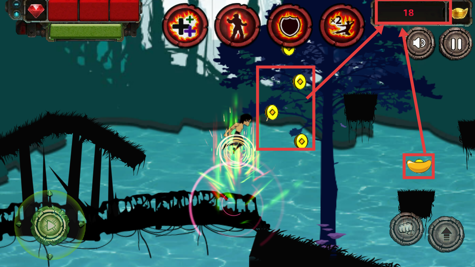 3、在场景中收集黄色金币与元宝,积累分数,提升游戏进度,应对后续更难的挑战。