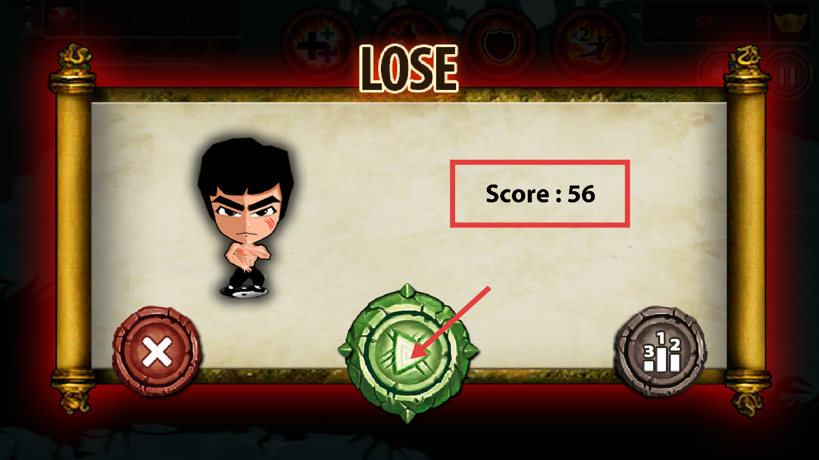 4、若出现“LOSE”失败界面,查看当前分数(如Score:56),点击绿色带三角的按钮重新开始游戏,再次挑战提升成绩。