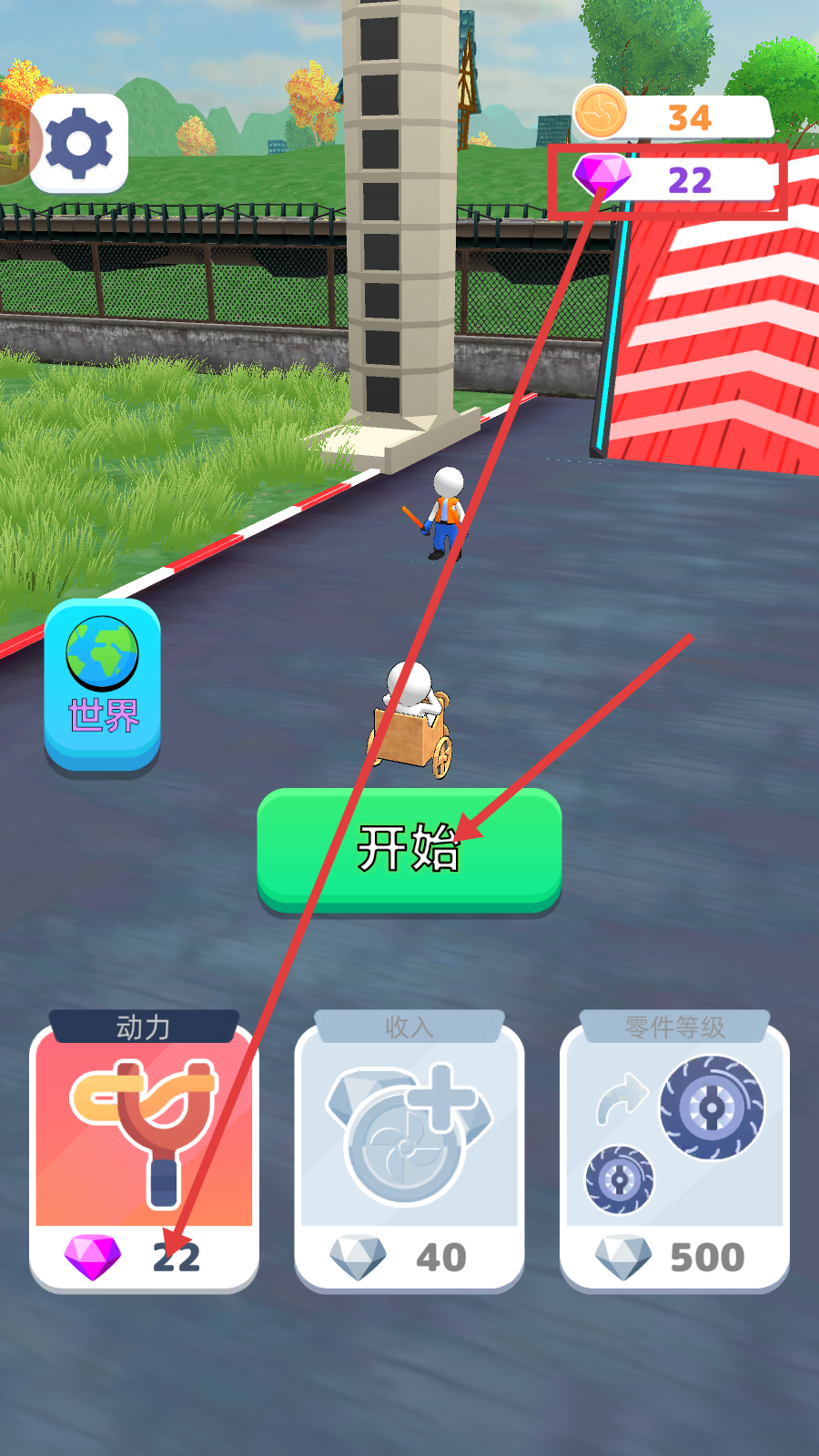 1、查看紫钻数量为【22】,用紫钻升级【动力】系统后,点击绿色【开始】按钮进入关卡。