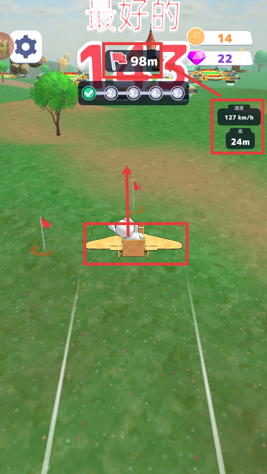 3、操控飞行中的车辆,关注【速度-127km/h】和【高-24m】,朝着距离【98m】的旗帜方向前进。