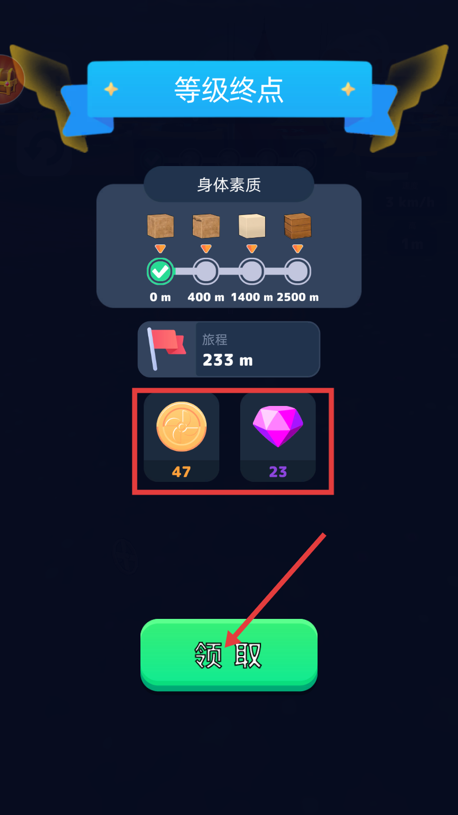4、到达【等级终点】后,可领取【金币-47】和【紫钻-23】奖励,点击绿色【领取】按钮获取资源。