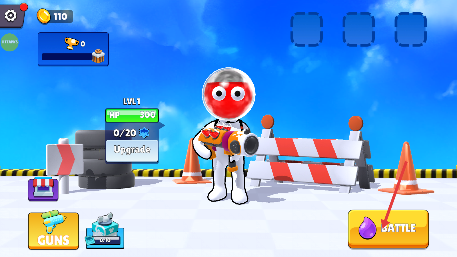 1、查看角色【LVL1】及【HP-300】,点击右下角带紫水滴的【BATTLE】按钮,进入战斗。