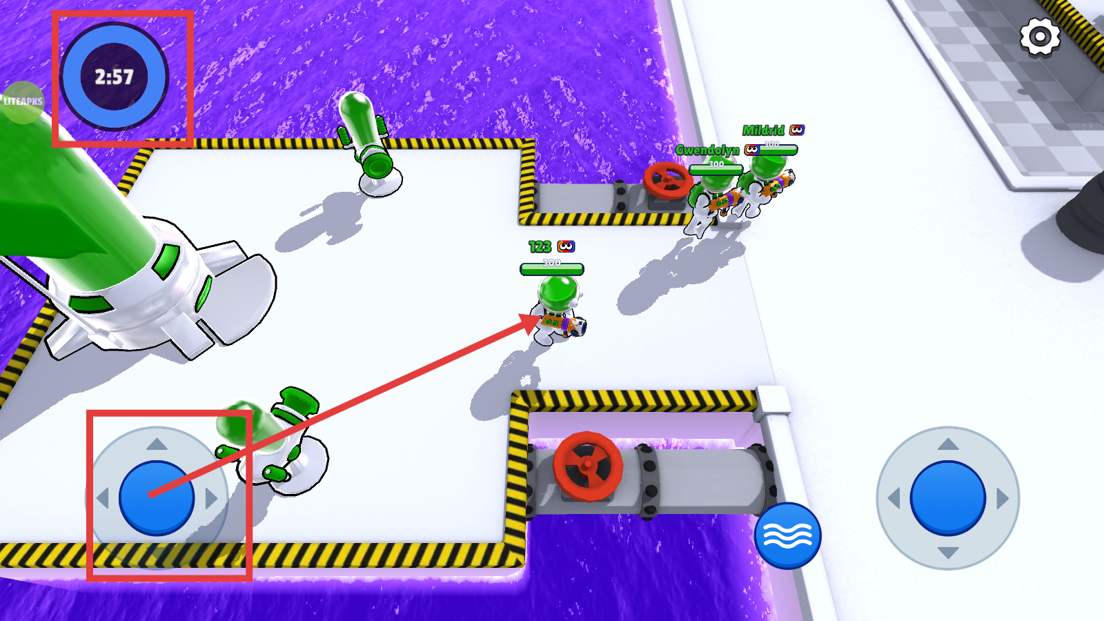 2、战斗限时【2:57】,用左侧方向按钮移动角色,和队友协同在场景中行动。