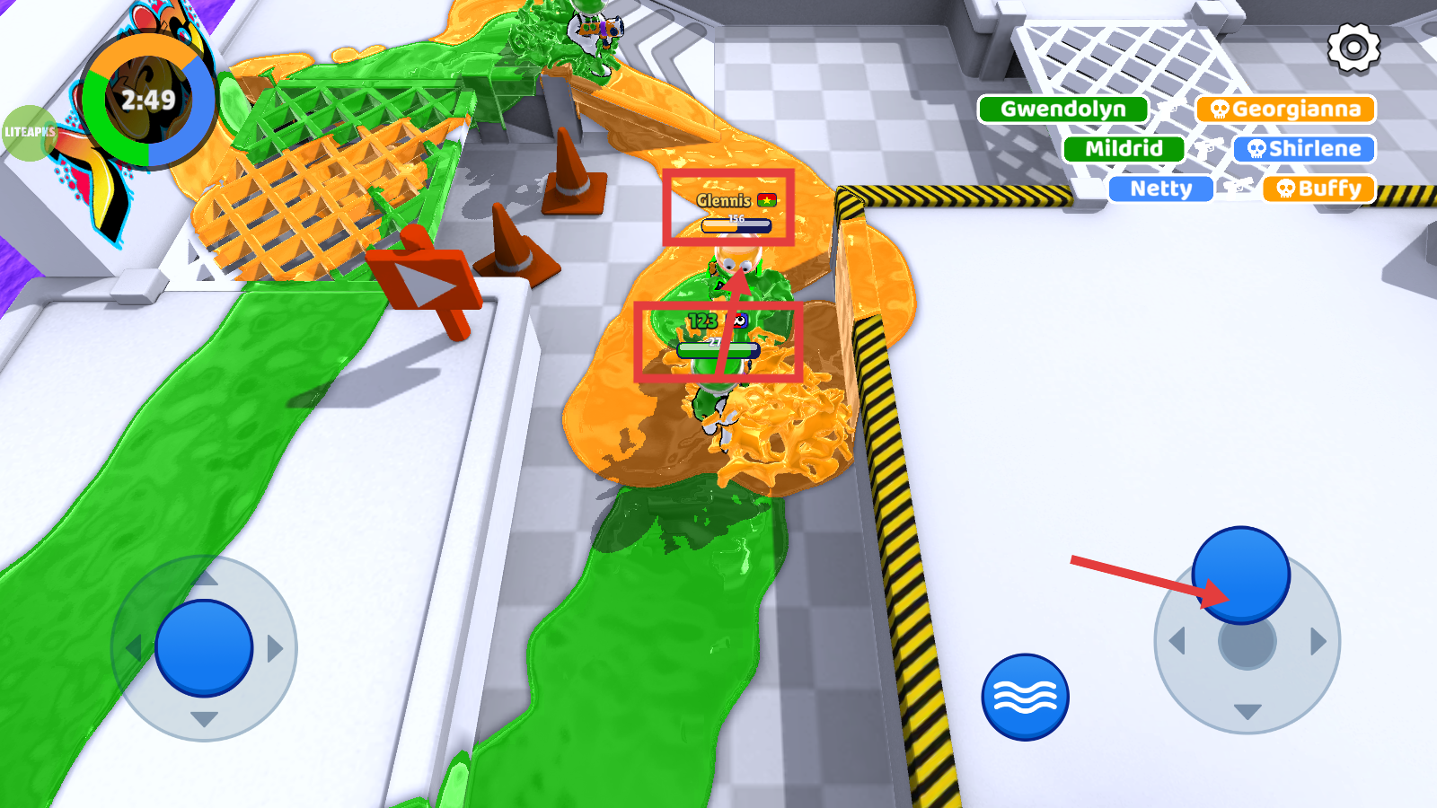 3、阵营对抗玩法:三支颜色队伍展开激烈领地争夺,需要通过团队配合占领敌方哨塔与基地,最终以颜色覆盖面积决定胜负。