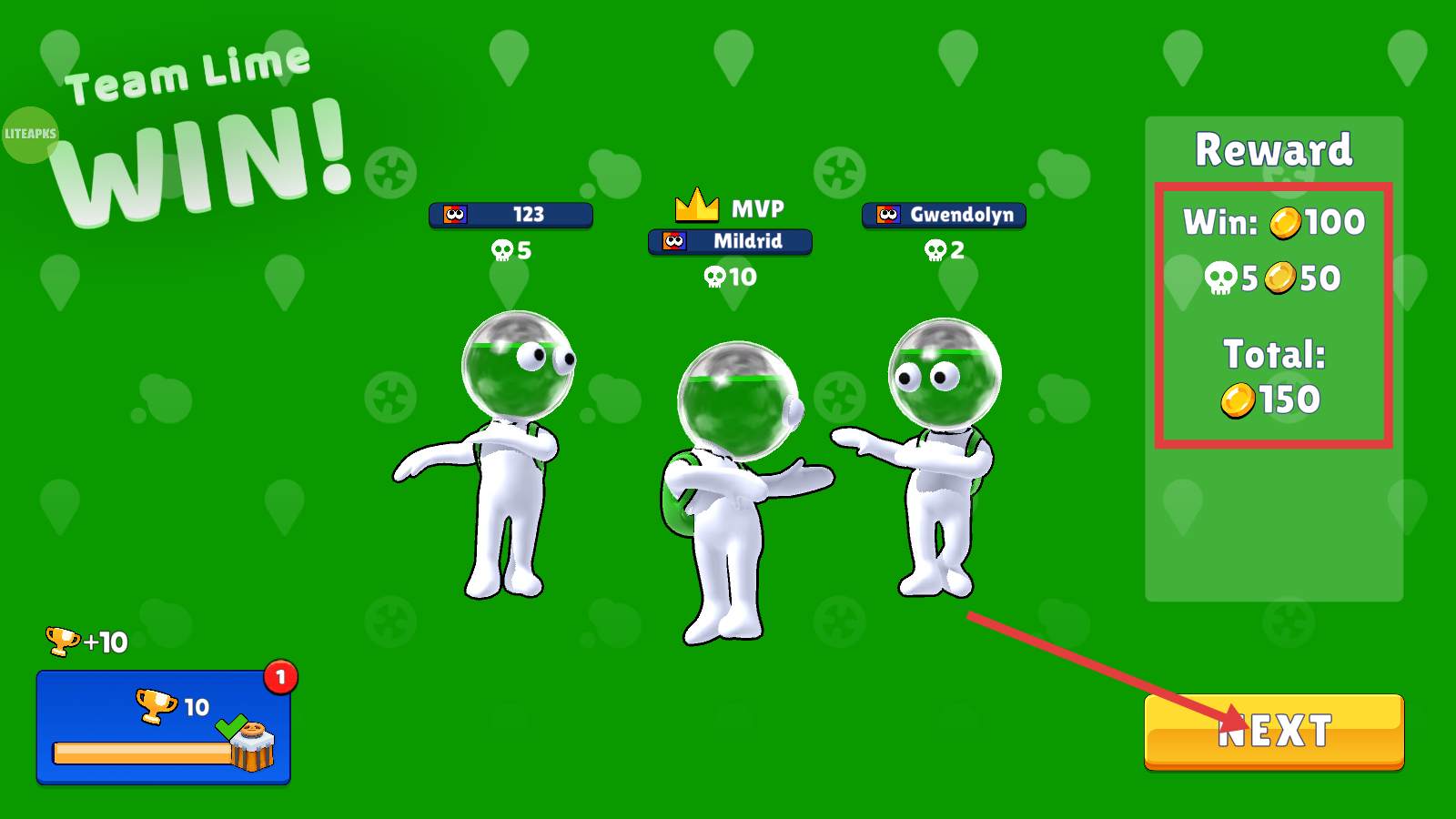 4、TeamLime获胜后,可获取【金币-150】奖励,点击黄色【NEXT】按钮进入下一场。