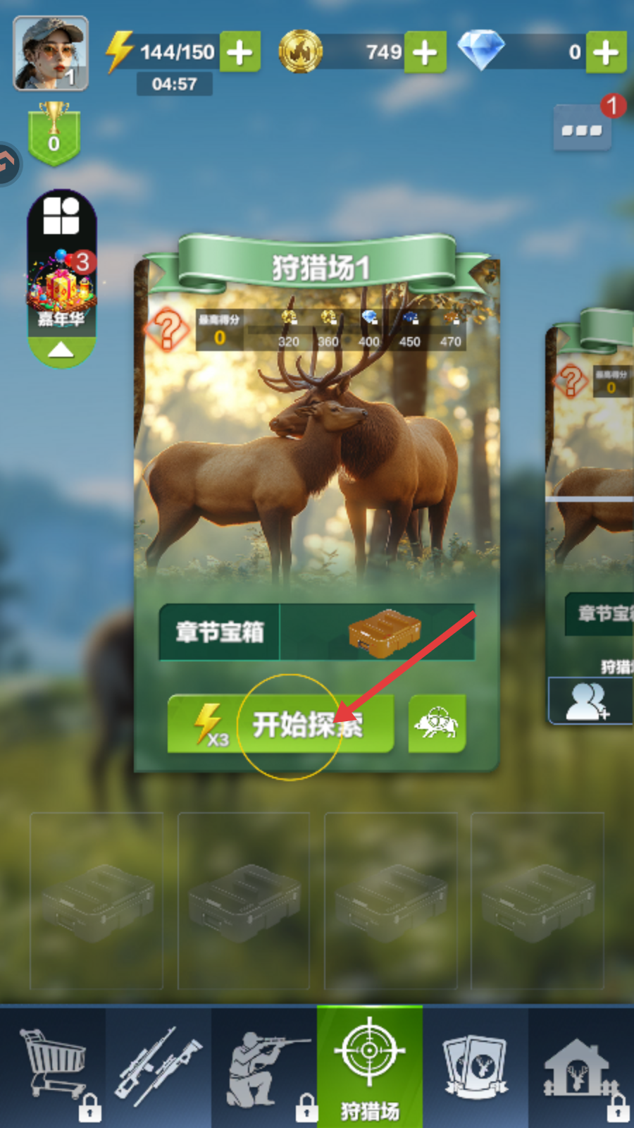 1、在【狩猎场1】界面,点击绿色【开始探索】按钮,消耗闪电进入狩猎场景,准备狩猎动物。