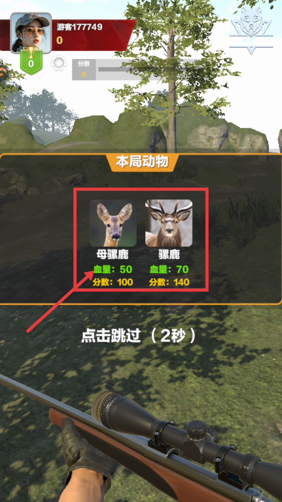 2、本局可狩猎【母骡鹿-血量50/分数100】和【骡鹿-血量70/分数140】,了解目标属性后开启狩猎。