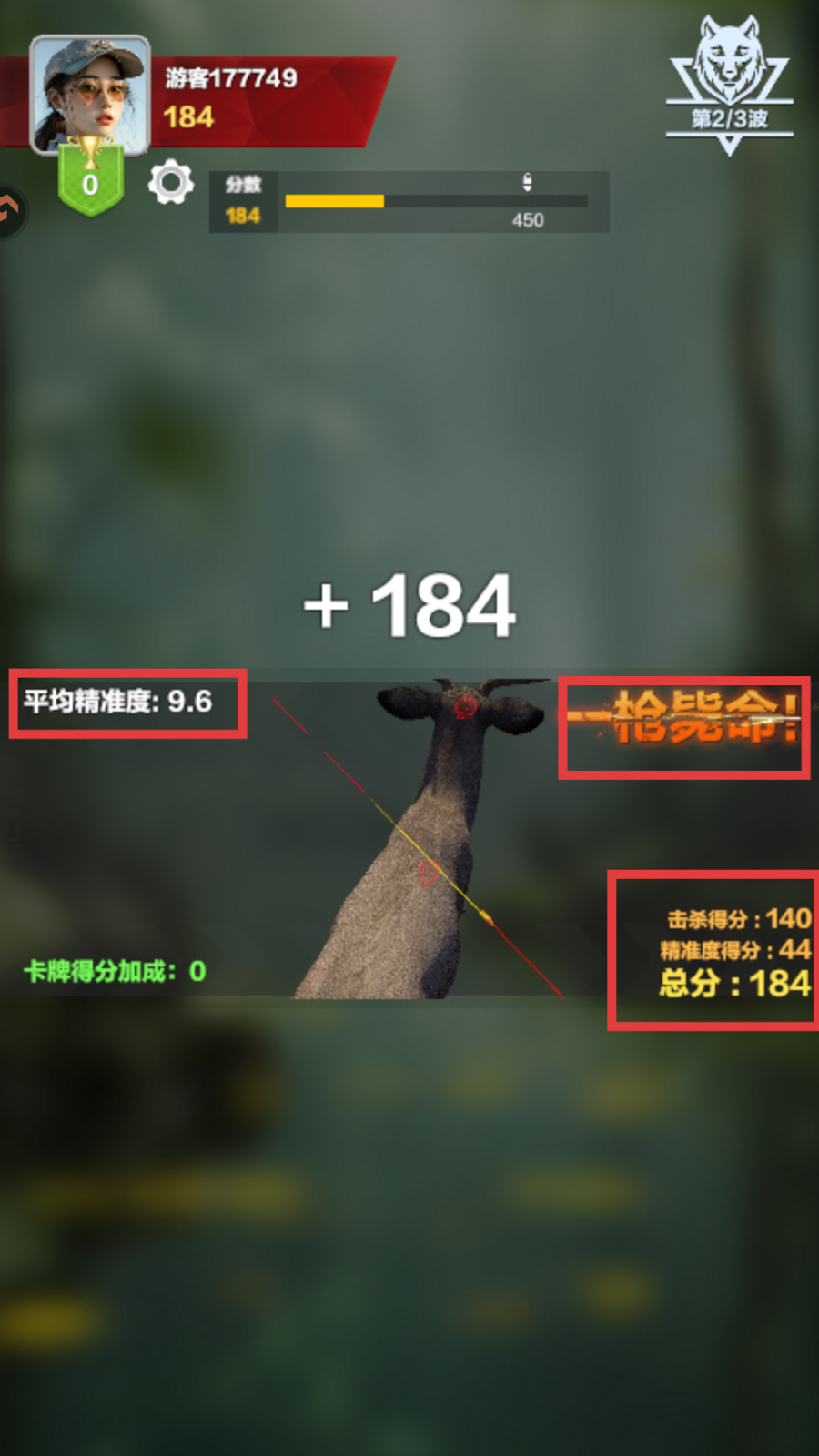 4、成功击杀后,可获得【击杀得分】与【精准度得分】,如“一枪毙命”时总分能高效提升,积累分数推进关卡。