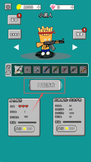 1、如何开始游戏并查看角色?在主界面点击“开始游戏”,选择“小黑人”角色,确认武器为“突击步枪”,等级显示为“级·100”。