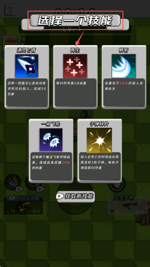 4、如何选择技能强化角色?在技能选择界面,点击“再生”或“子弹摩片”等技能,再点击“D获取新技能”即可装备并提升战斗力。