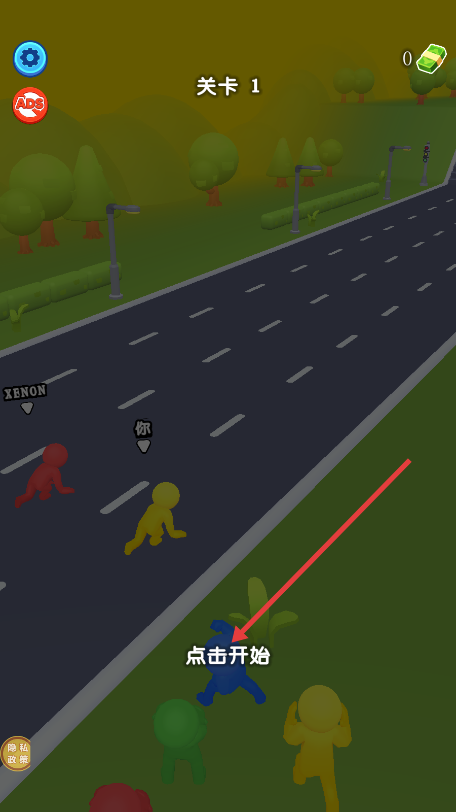 1、进入【关卡1】,点击“点击开始”,与其他彩色小人一同在道路上准备竞速挑战。