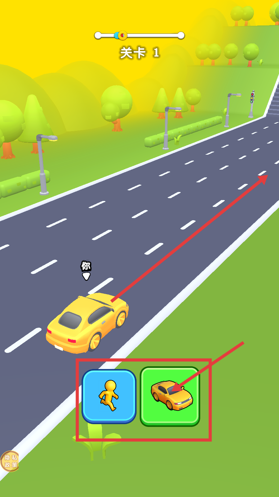 2、挑战中可切换【人物】或【汽车】形态,选择汽车形态时,操控黄色汽车沿道路向前行驶,抢占先机。
