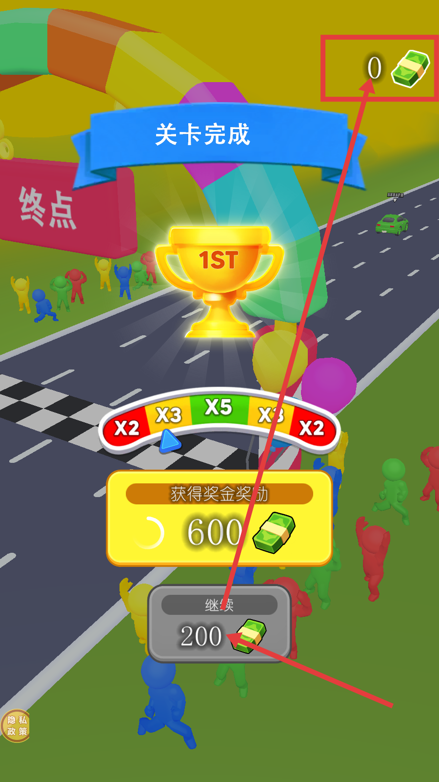 4、成功抵达终点后,关卡完成,获得【1ST】奖杯,还能领取【600】奖金奖励,点击“继续”可获取【200】奖金。