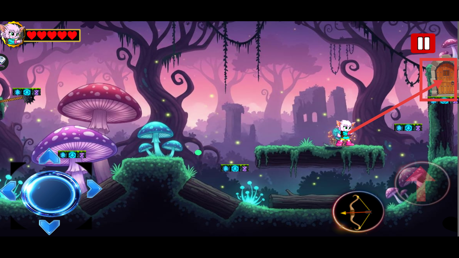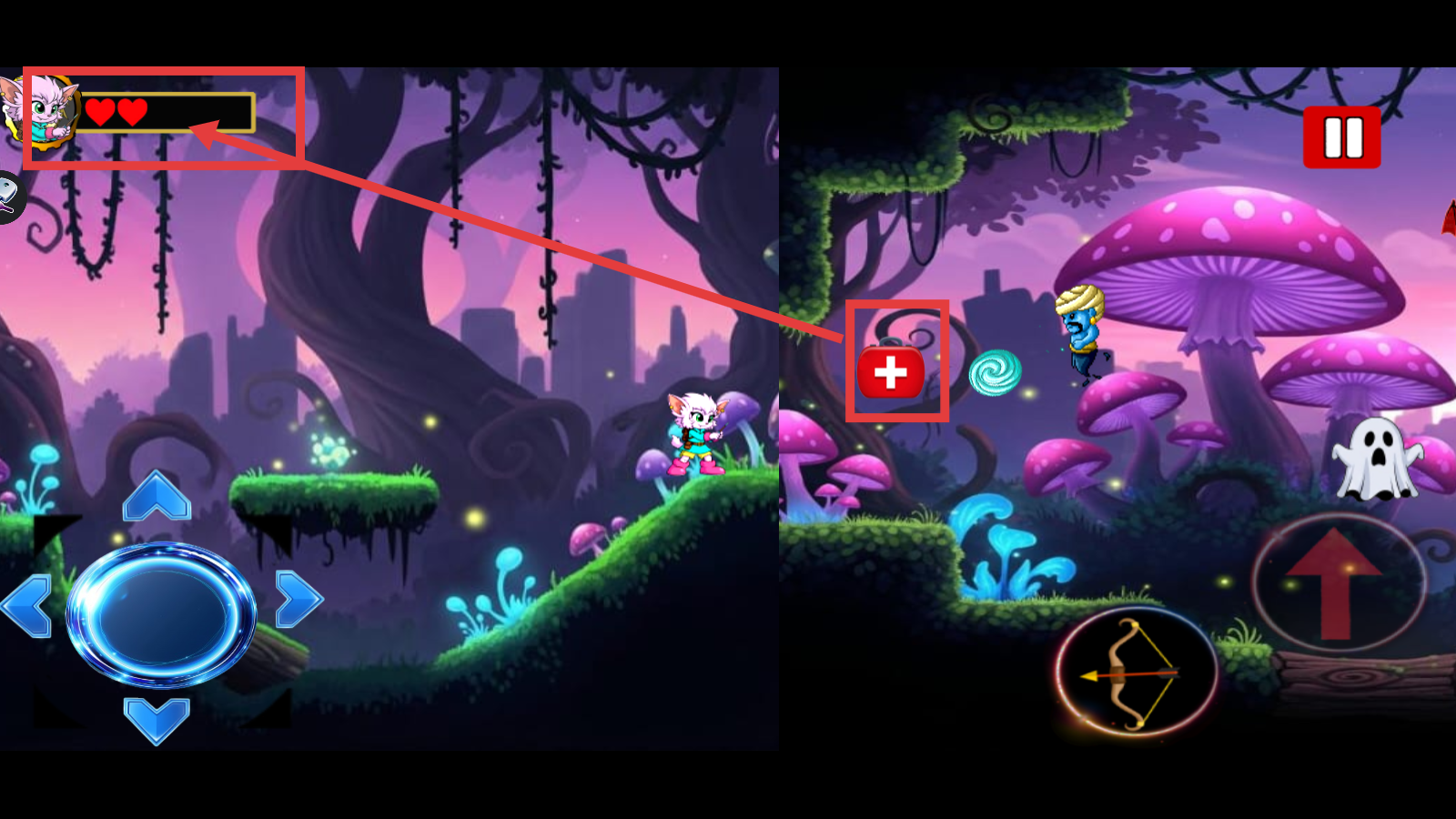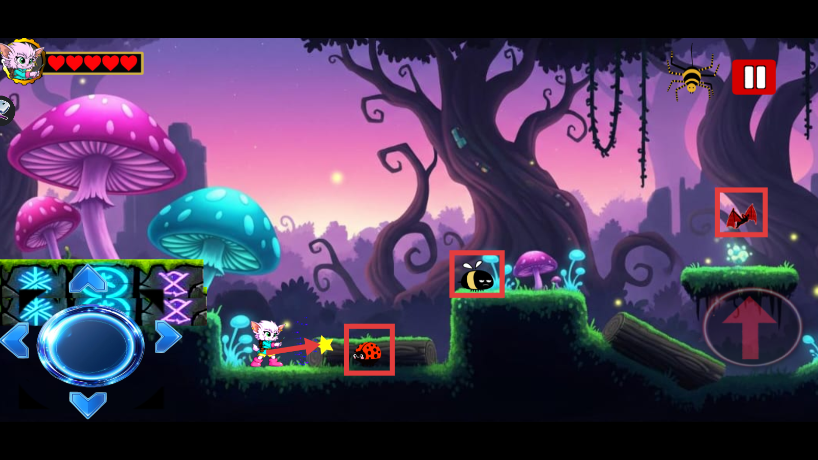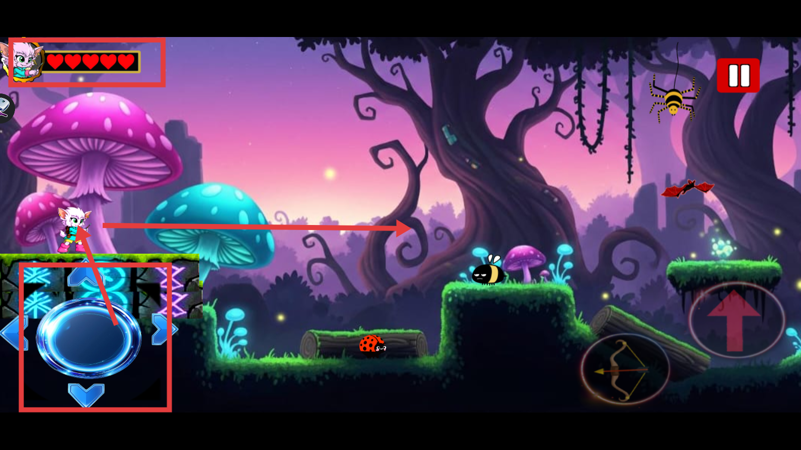 1、借助左侧虚拟摇杆控制角色在蘑菇森林移动,关注上方生命值,避开蜘蛛、蝙蝠等敌人,安全探索场景。
