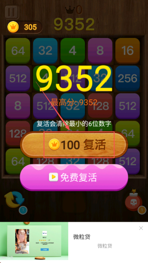 4、最后,无法移动时点击“免费复活”清最小六位继续挑战最高分。