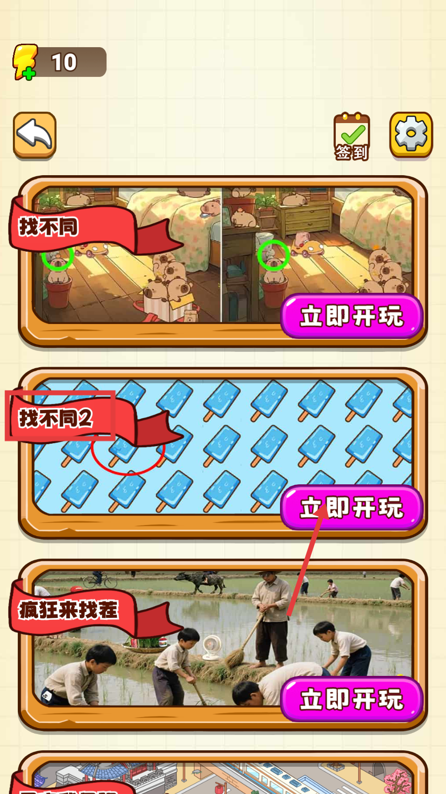 1、选择“找不同”“找不同2”或“疯狂来找茬”等模式,点击对应的【立即开玩】按钮,进入游戏关卡。