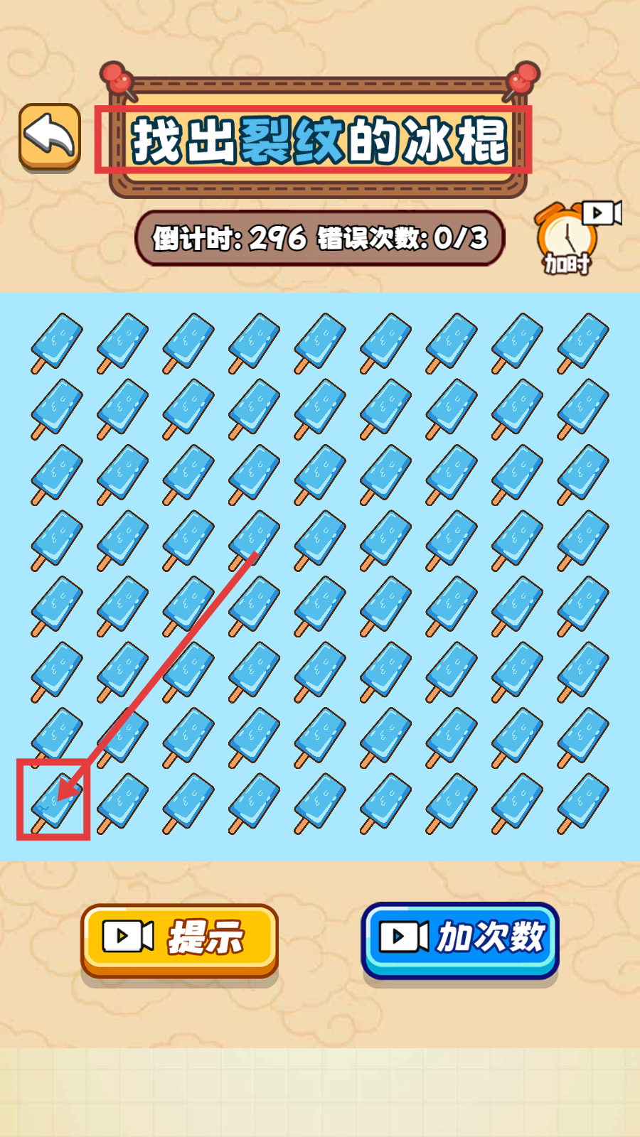 2、在“找出裂纹的冰棍”关卡中,仔细观察密集排列的冰棍,快速识别带有裂纹的冰棍并点击。