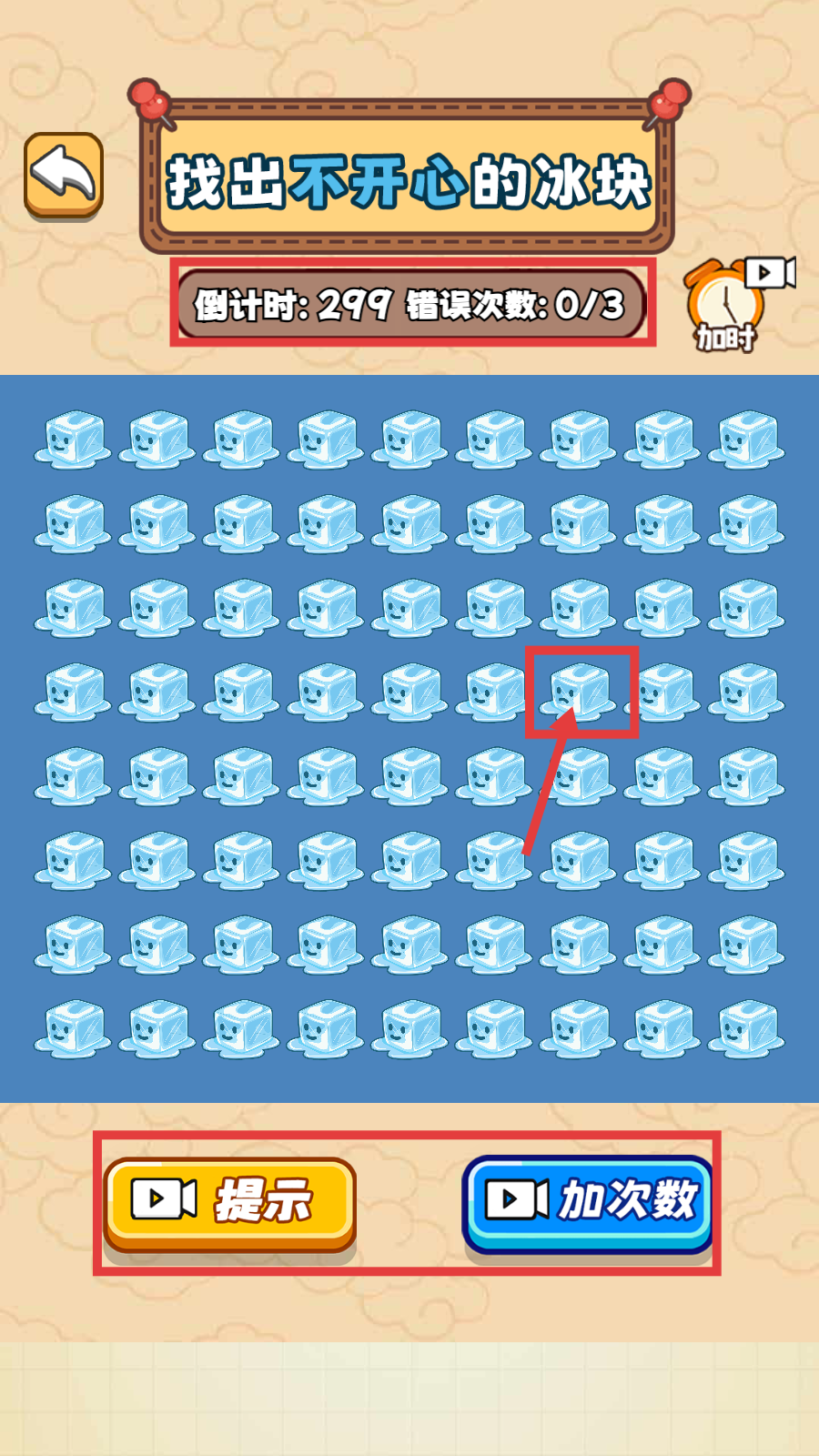 3、“找出不开心的冰块”关卡里,留意冰块的表情,若错误次数快到上限,可点击【提示】或【加次数】按钮辅助通关。