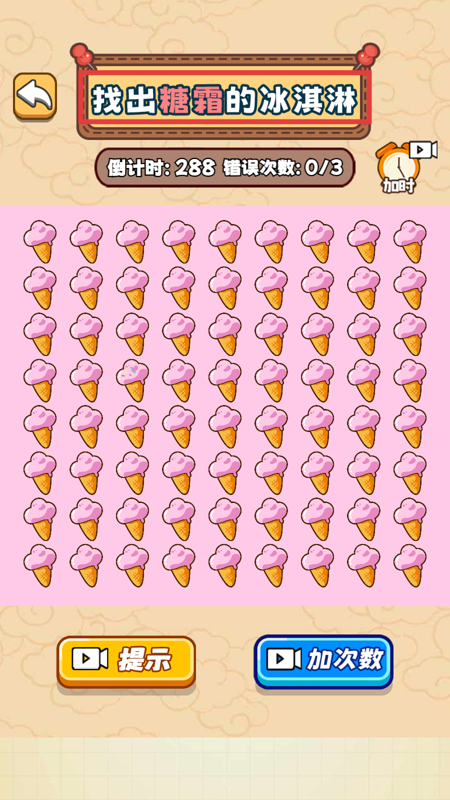 4、“找出糖霜的冰淇淋”关卡时,认真查看每一个冰淇淋的外观,找出表面带有糖霜装饰的冰淇淋并点击。