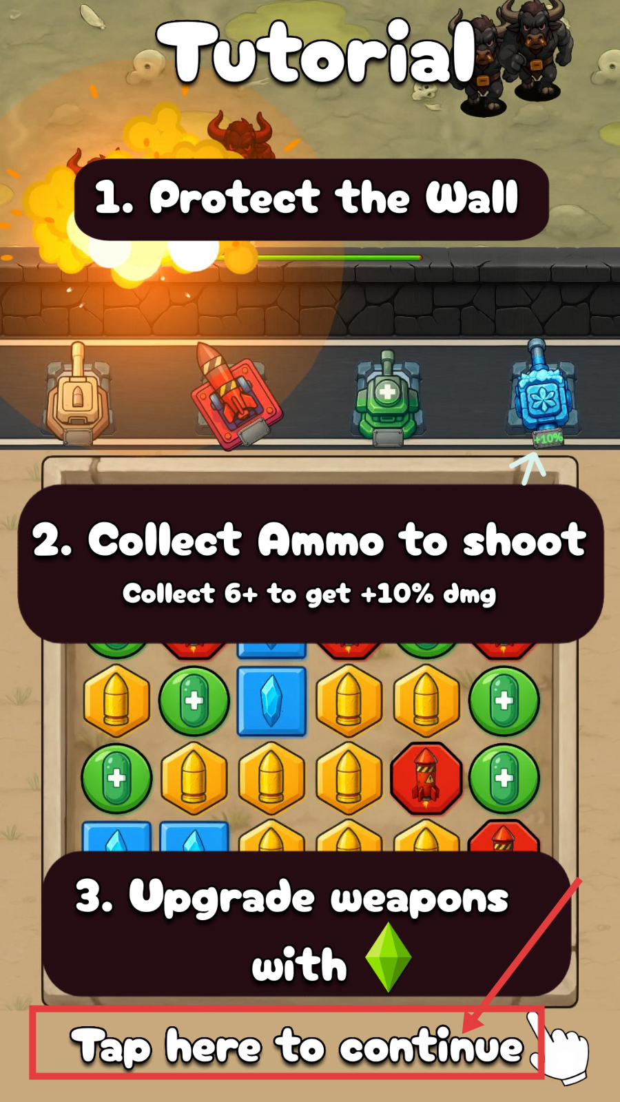 1、进入教程【Tutorial】后,明确目标:保护城墙,收集弹药射击,用绿宝石升级武器,然后点击【Tap-here-to-continue】继续。