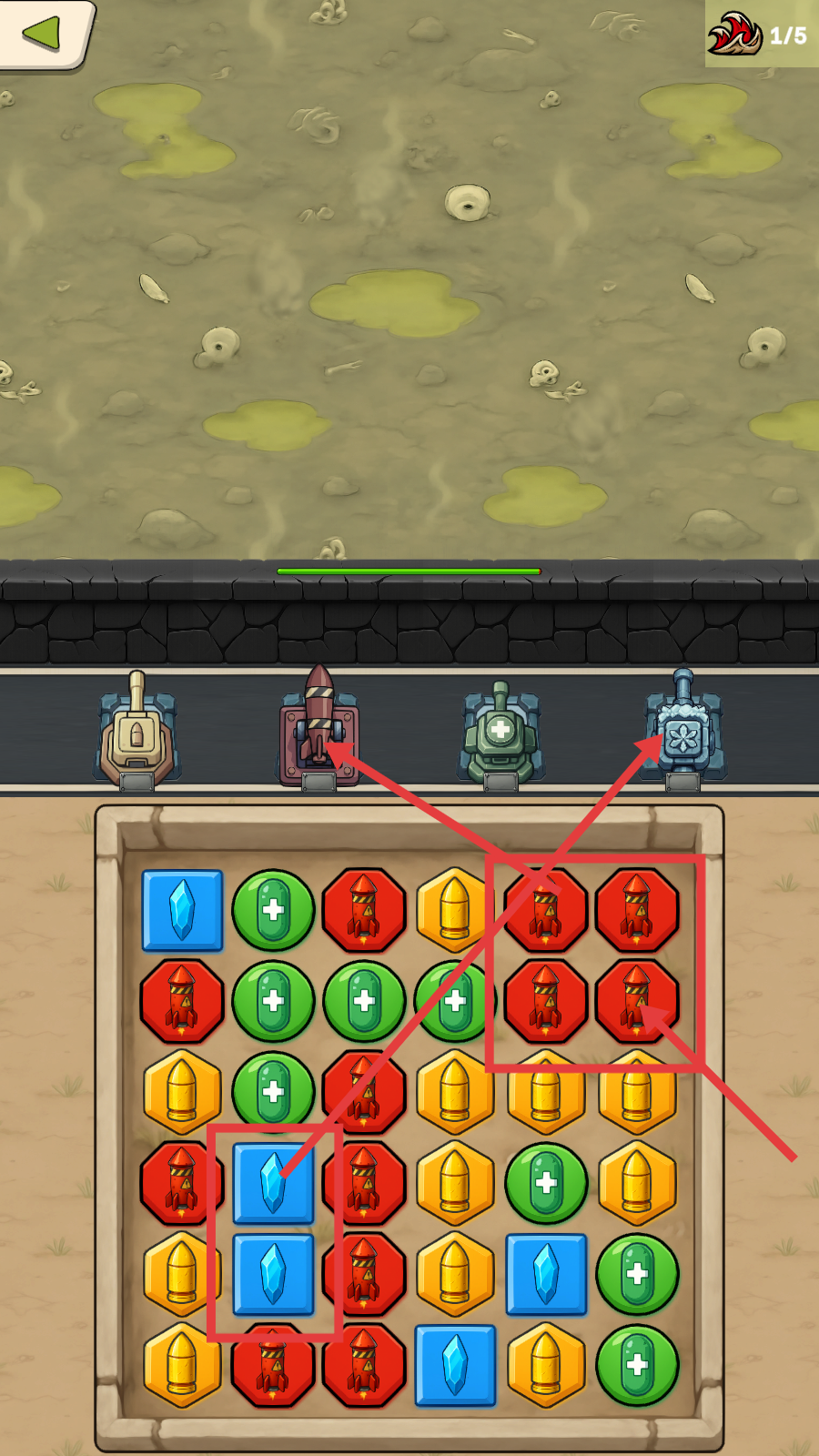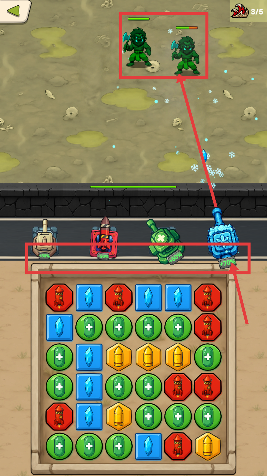 2、在元素匹配界面,将相同的火箭、蓝色水晶等元素匹配,为对应的火箭发射器、冰霜武器等提供能量,使其能攻击敌人。