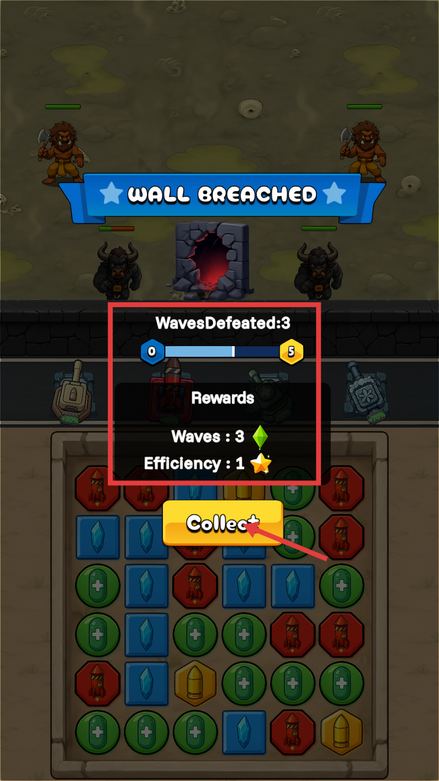 4、当界面显示【WALL-BREACHED】时,代表关卡结算,此时可查看击败的波数与奖励,点击【Collect】按钮收集绿宝石和星级奖励。
