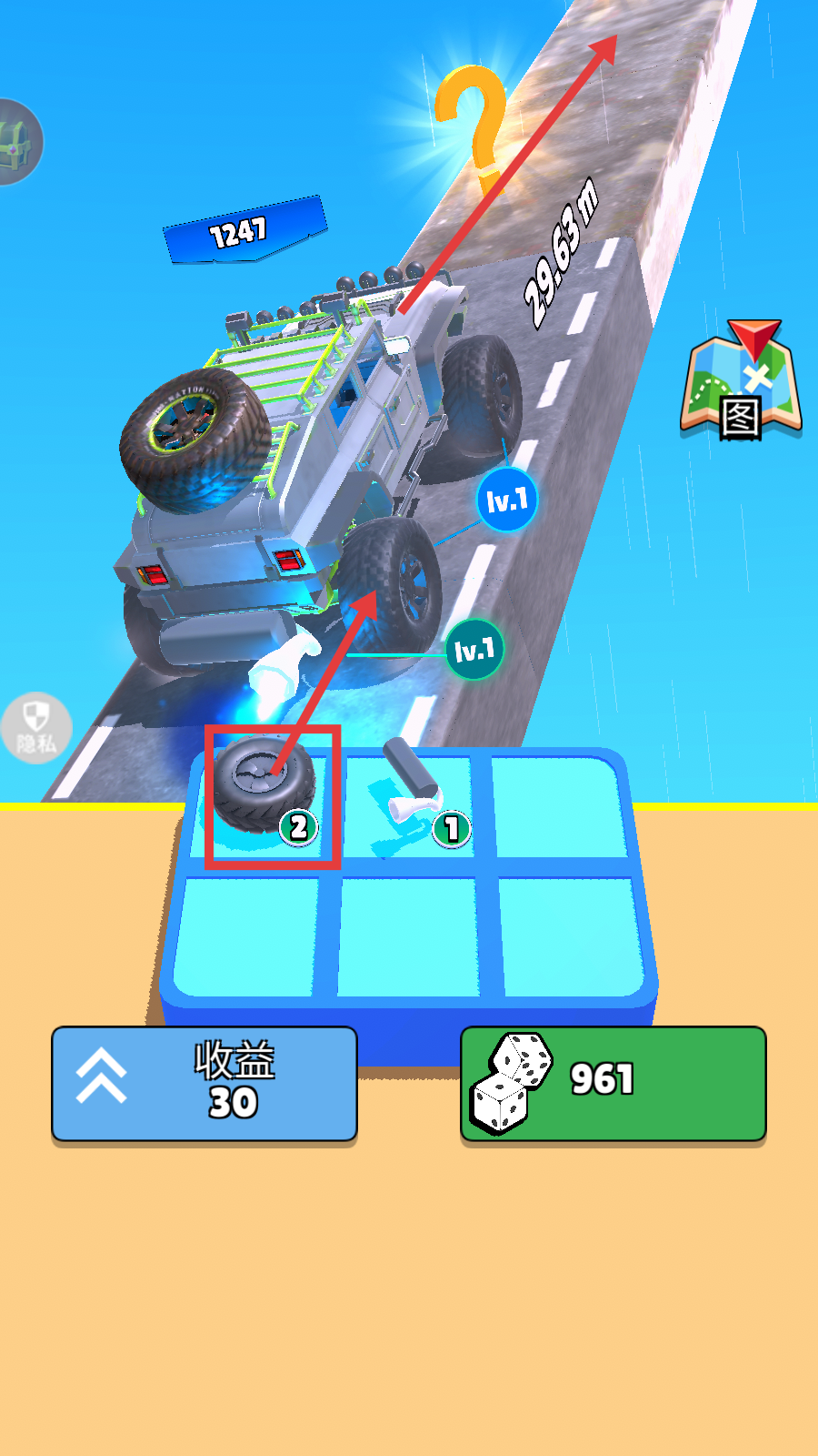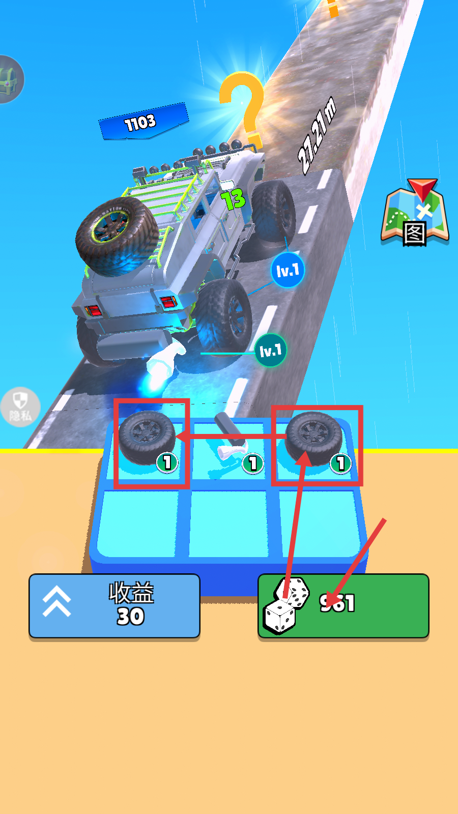 3、合并相同等级的部件(如把【轮胎-1】合并为【轮胎-2】),并将升级后的部件安装到车辆上,能让车辆在道路上行驶更远的距离。