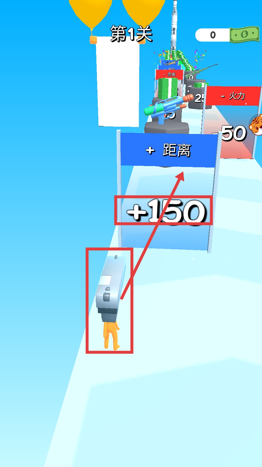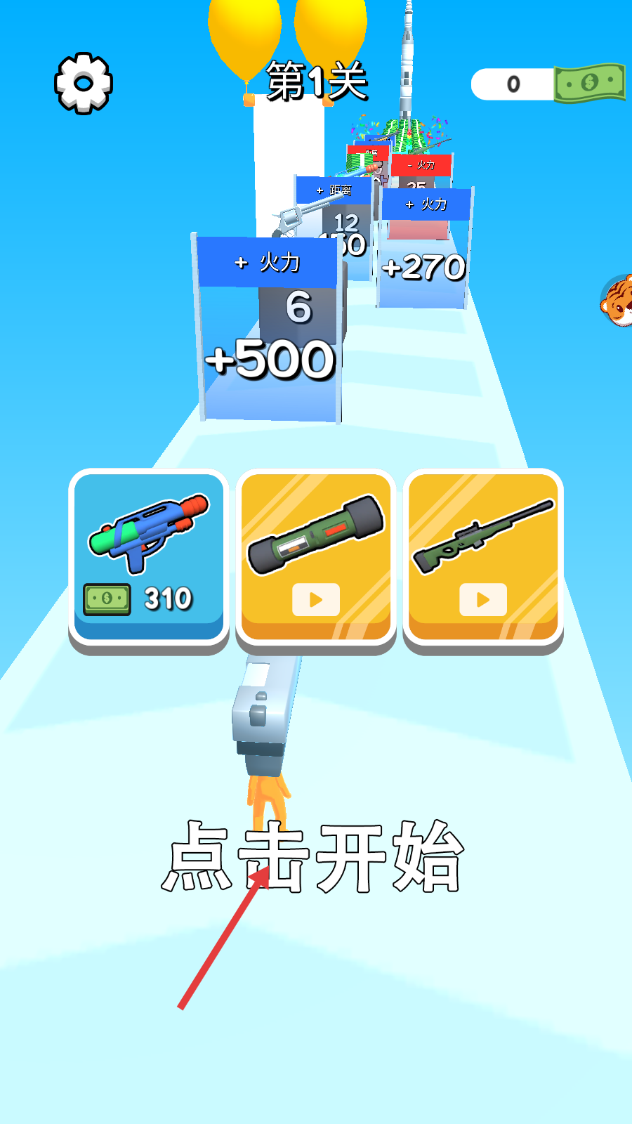 1、第1关点击【点击开始】,可选择初始武器,赛道存在【+火力+500】等增益道具,优先靠近提升火力。