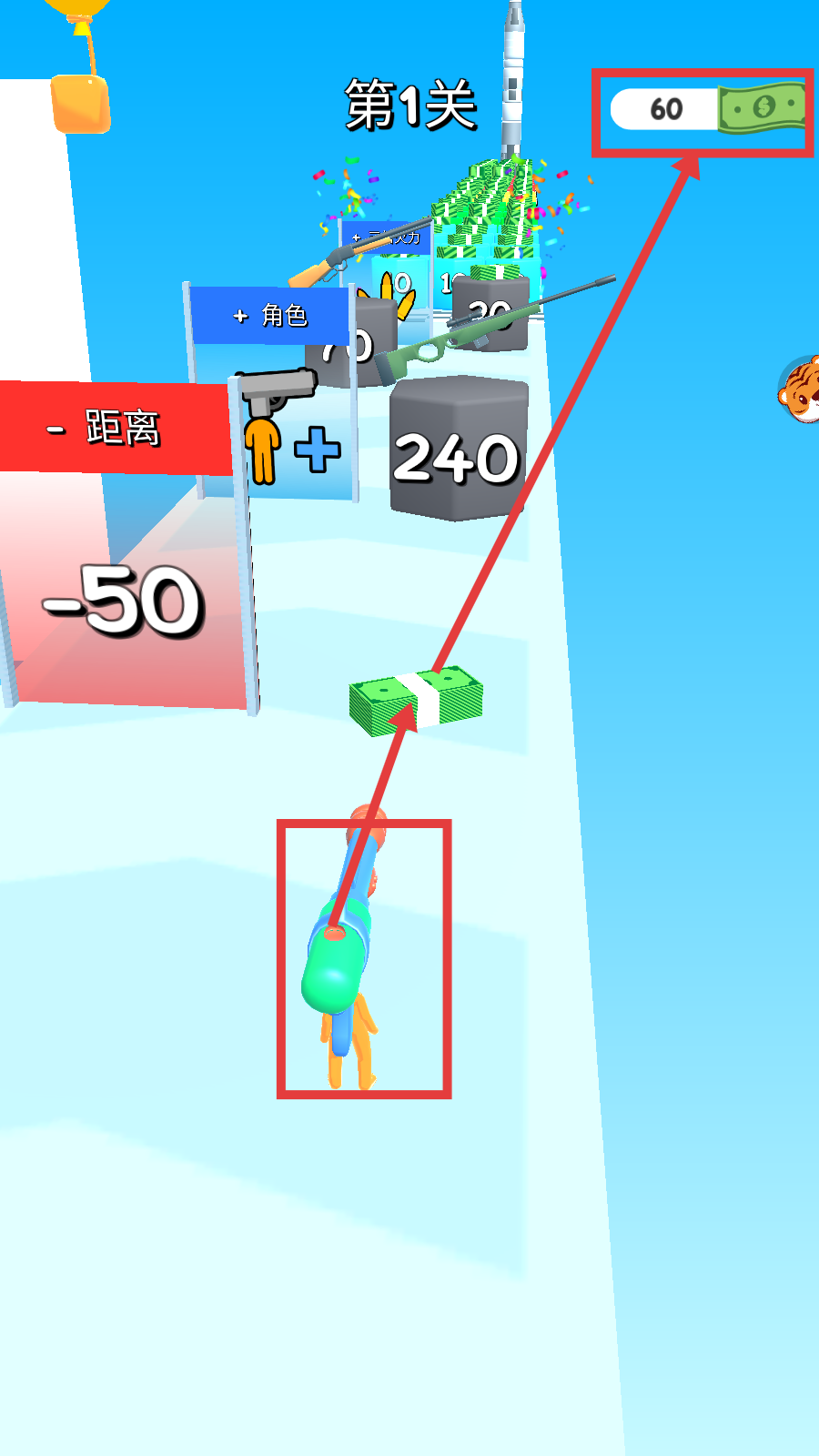 3、行驶过程中收集赛道上的钞票,同时靠近【+角色】等增益牌,积累钞票数量,为后续升级武器做准备。