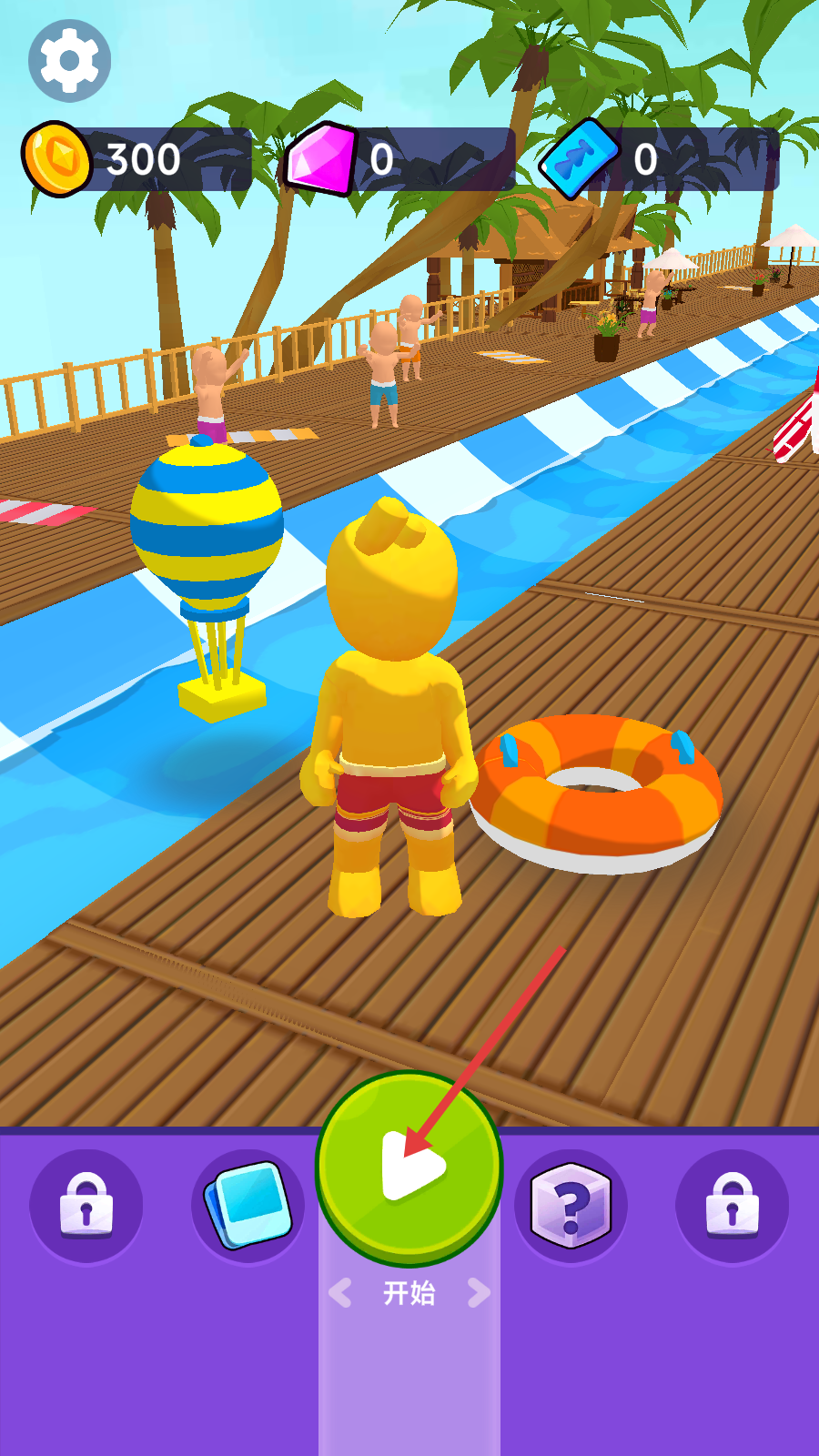 1、在初始界面,点击绿色【开始】按钮,操控黄色角色带着救生圈,进入水上赛道开启竞速。