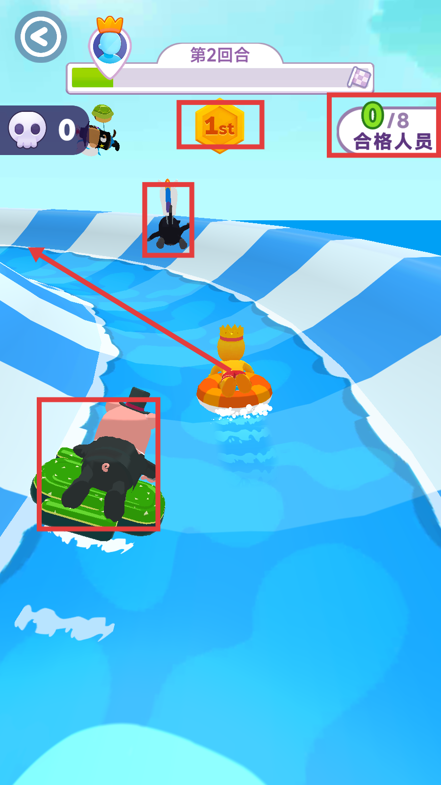 2、第2回合时,在水滑道上避开其他角色(如粉色猪形角色等),争取保持【1st】排名,向“合格人员”目标推进。