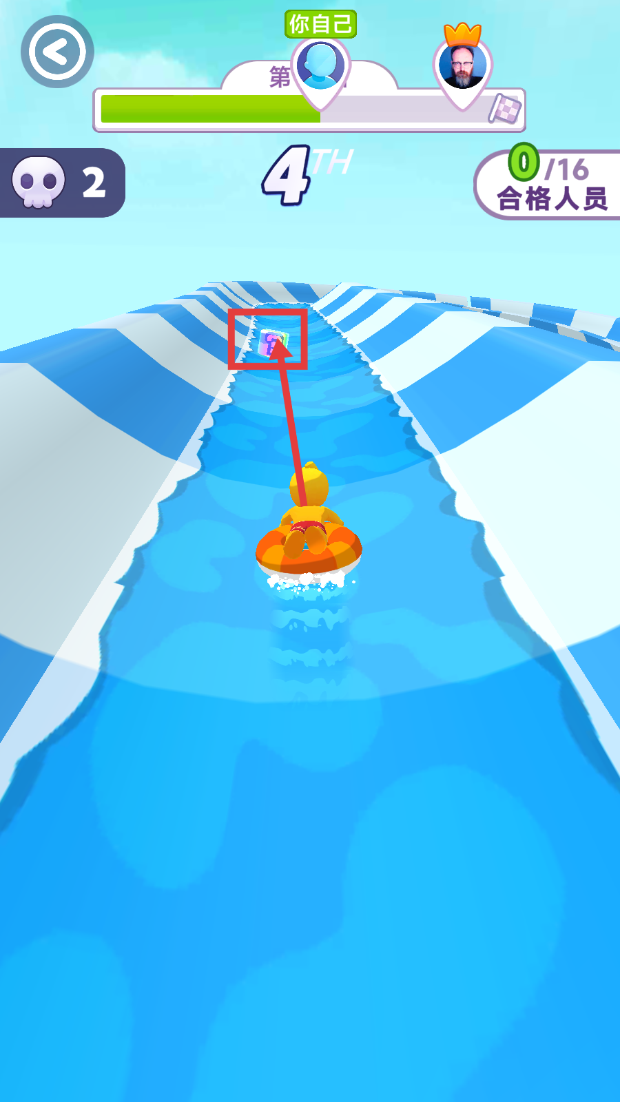 3、操控角色在水滑道行驶时,收集赛道中的道具,提升自身排名,同时留意“合格人员”数量进度,努力达标。