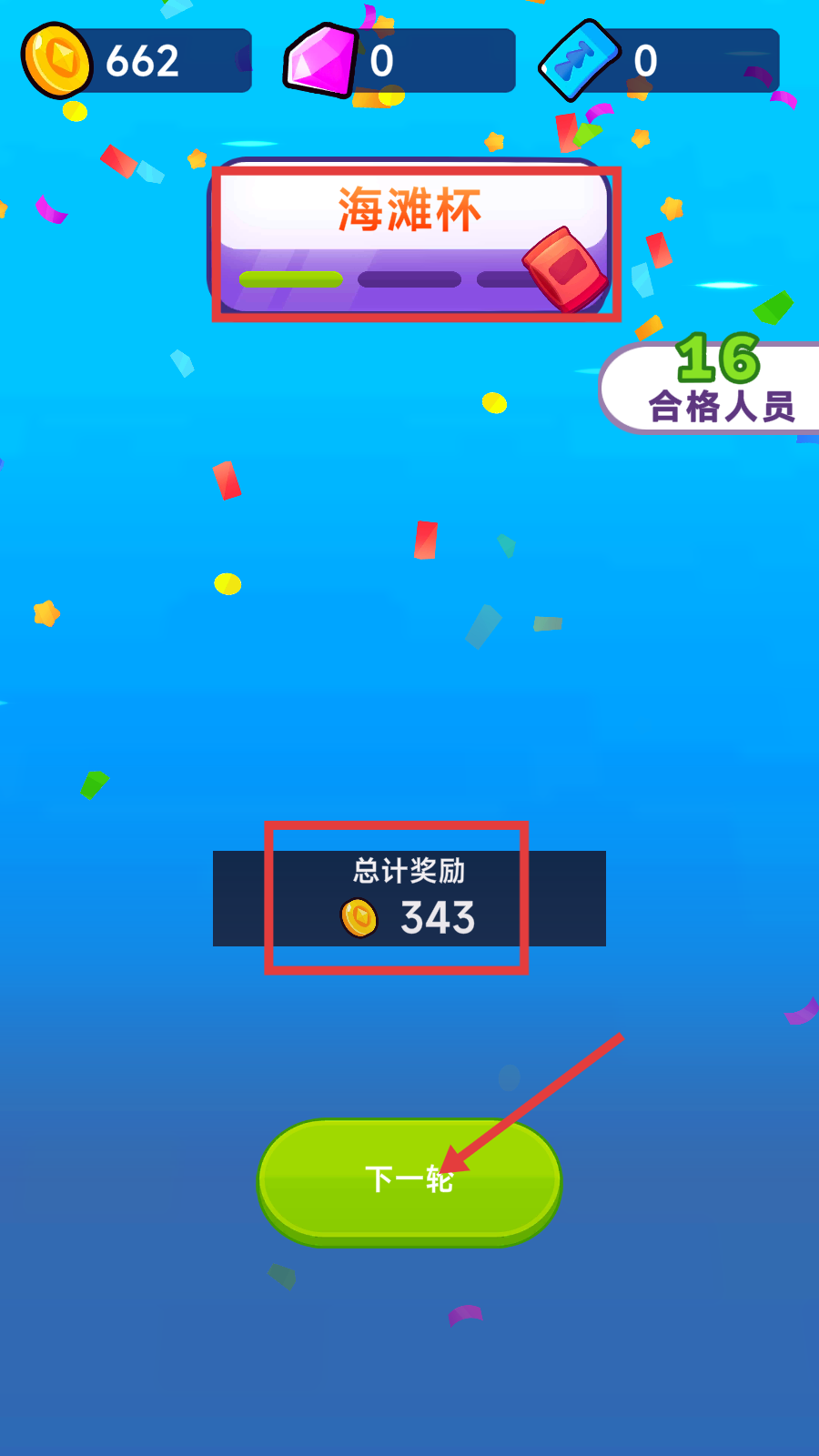 4、通关后可获得【海滩杯】与总计奖励(如343金币),点击【下一轮】按钮,继续参与水上竞速获取更多奖励。