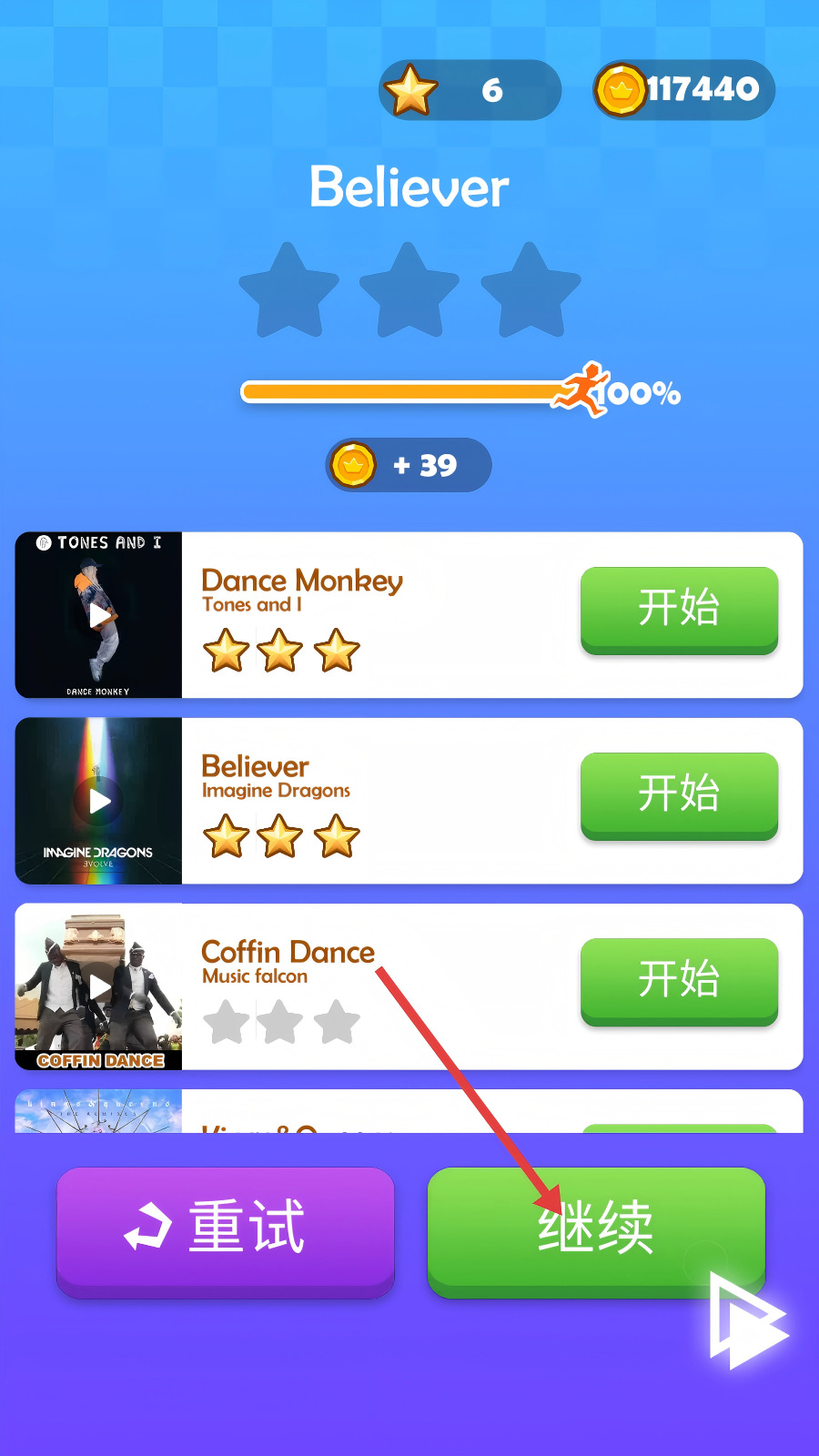 4、通关【Believer】关卡后,可获得金币与星级奖励,点击【继续】按钮可进入后续流程或选择新歌曲挑战。