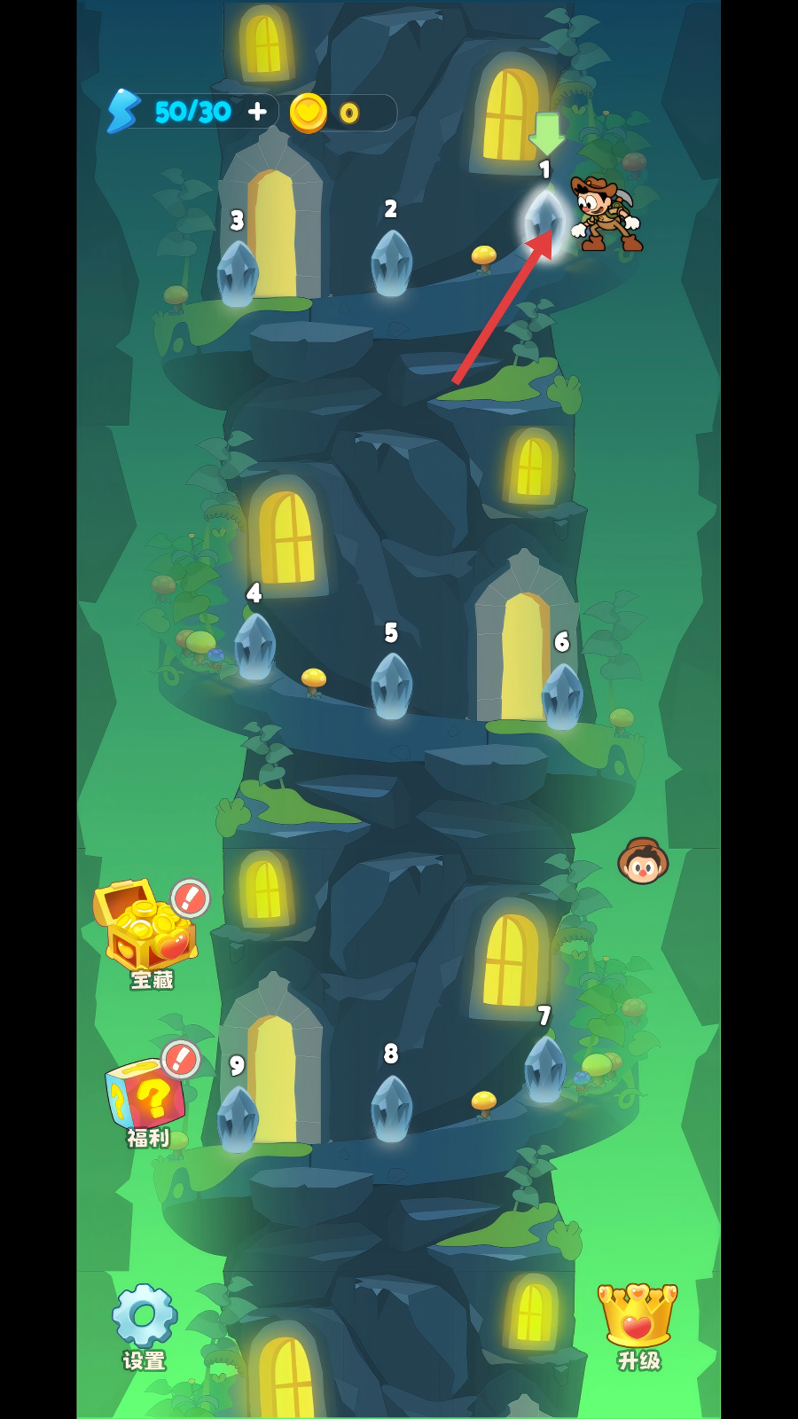 1、进入游戏关卡选择界面,点击标有【1】的关卡入口,即可开启第1关的冒险,准备探索收集资源。