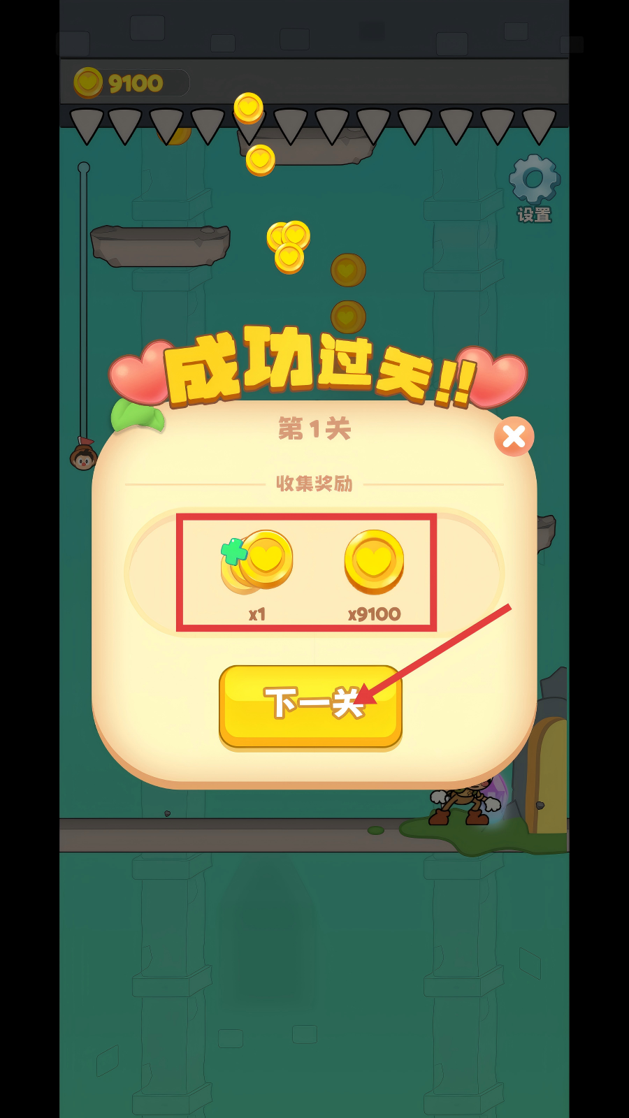 4、成功过关后,会获得【金币】等收集奖励,点击黄色【下一关】按钮,可继续挑战下一个关卡。