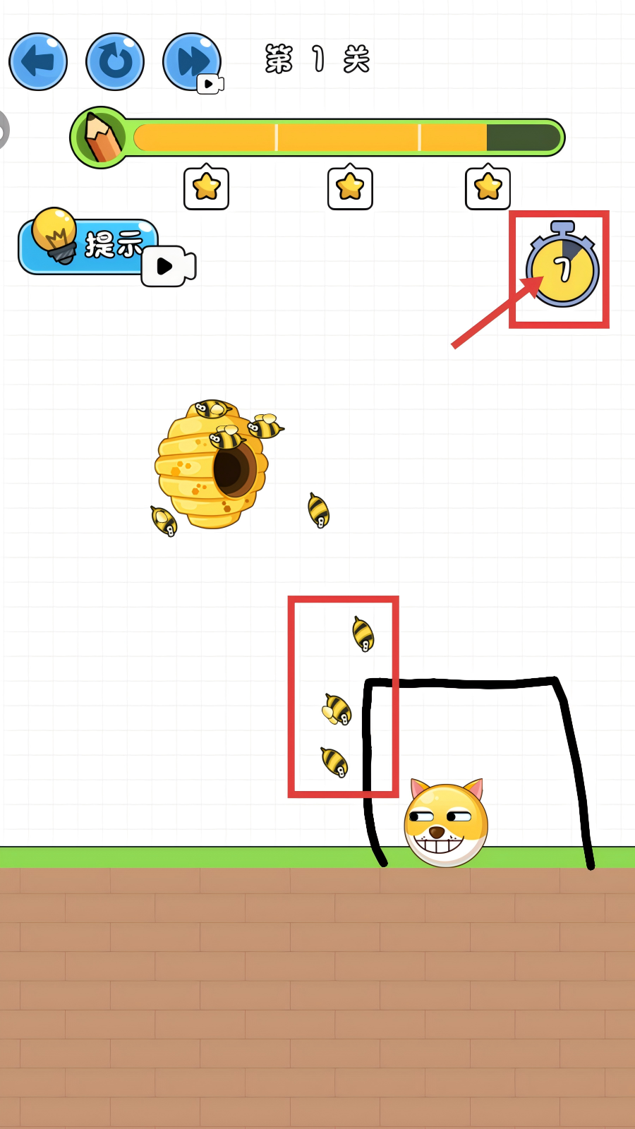 3、留意右上角计时器,快速划线形成屏障,阻挡蜜蜂攻击,保护角色安全通过。