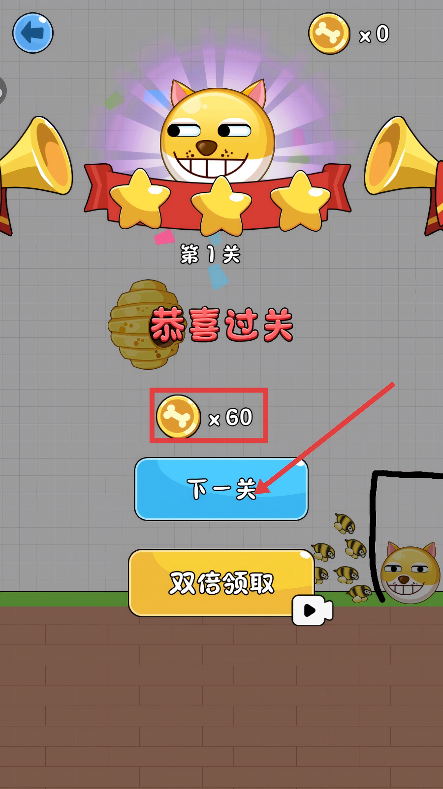 4、成功通关第1关后,可领取【金币×60】奖励,点击【下一关】按钮继续挑战新关卡。