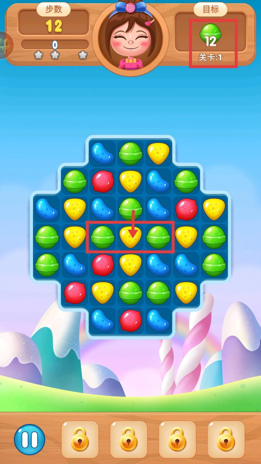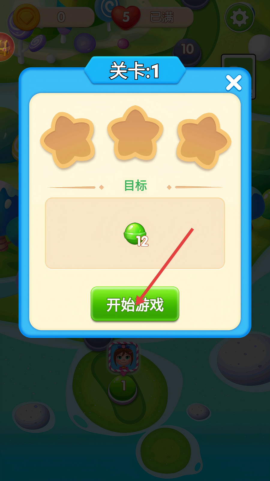 1、进入关卡1,目标收集【12】个绿色糖果,点击绿色【开始游戏】按钮,开启消除挑战。