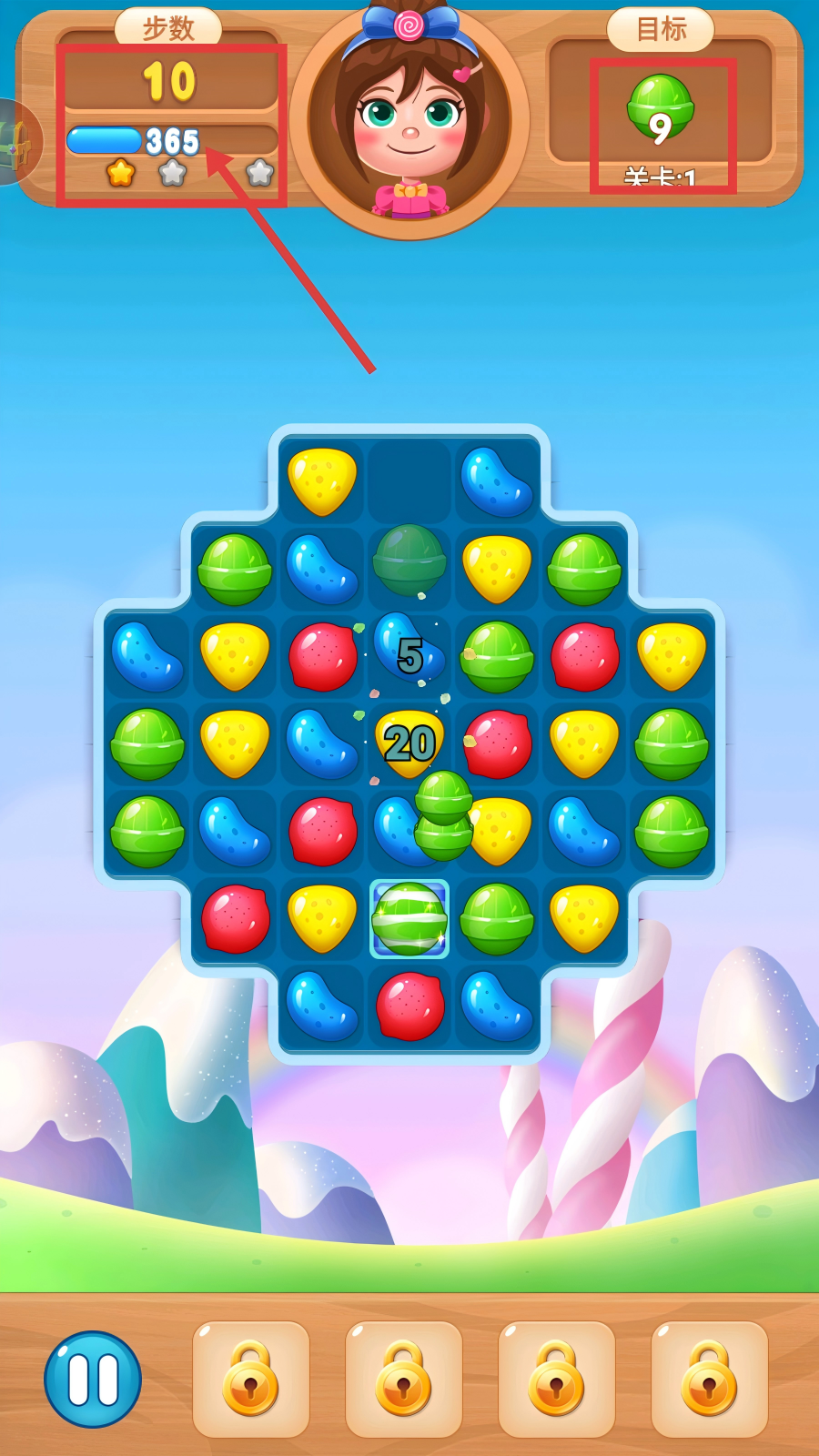 3、留意左上角步数,剩余【10】步时合理规划消除,通过组合糖果获得分数,同时减少目标绿色糖果数量。