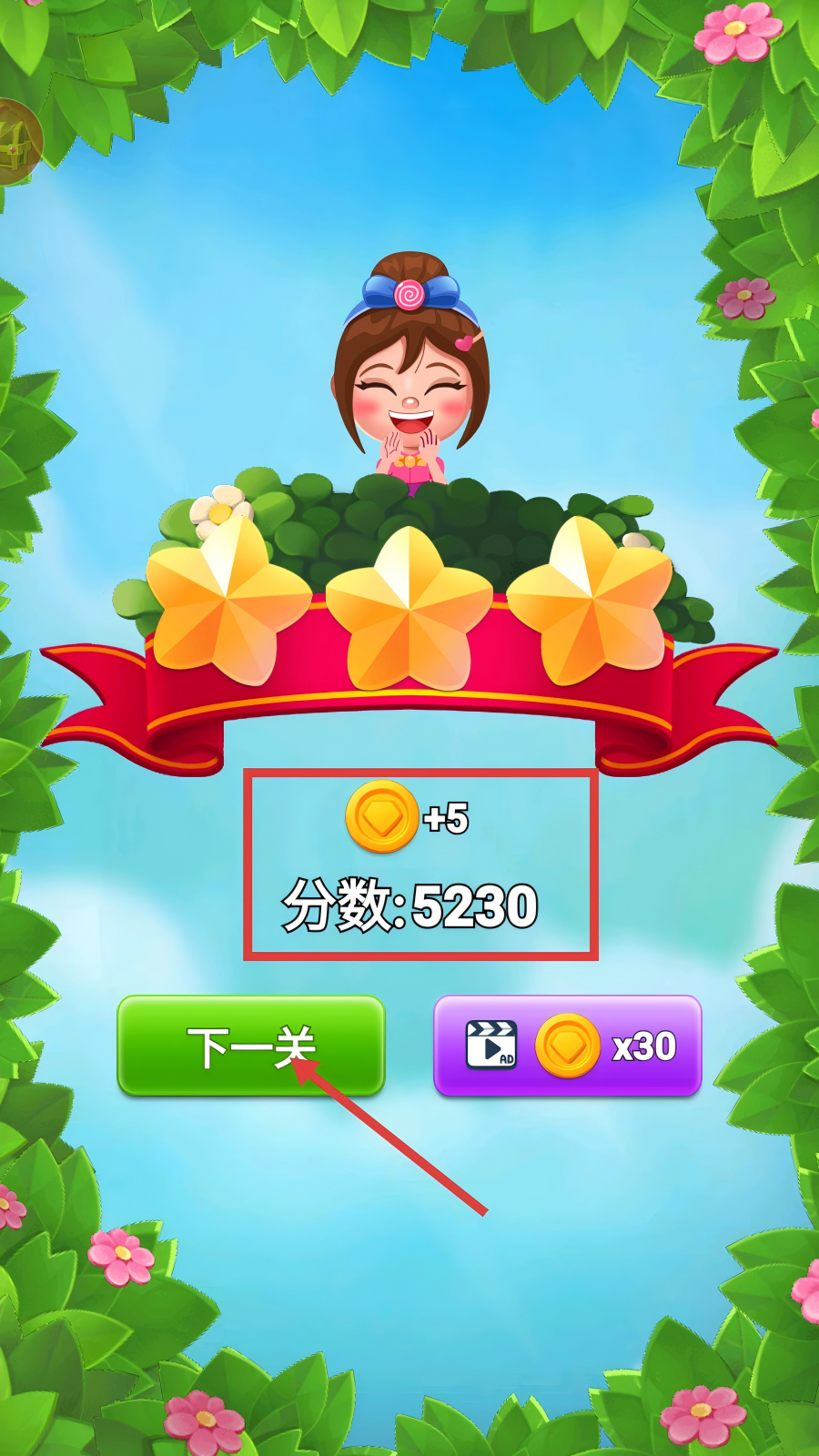4、成功通关后,可获得【金币+5】与分数【5230】,点击绿色【下一关】按钮,继续挑战新关卡。