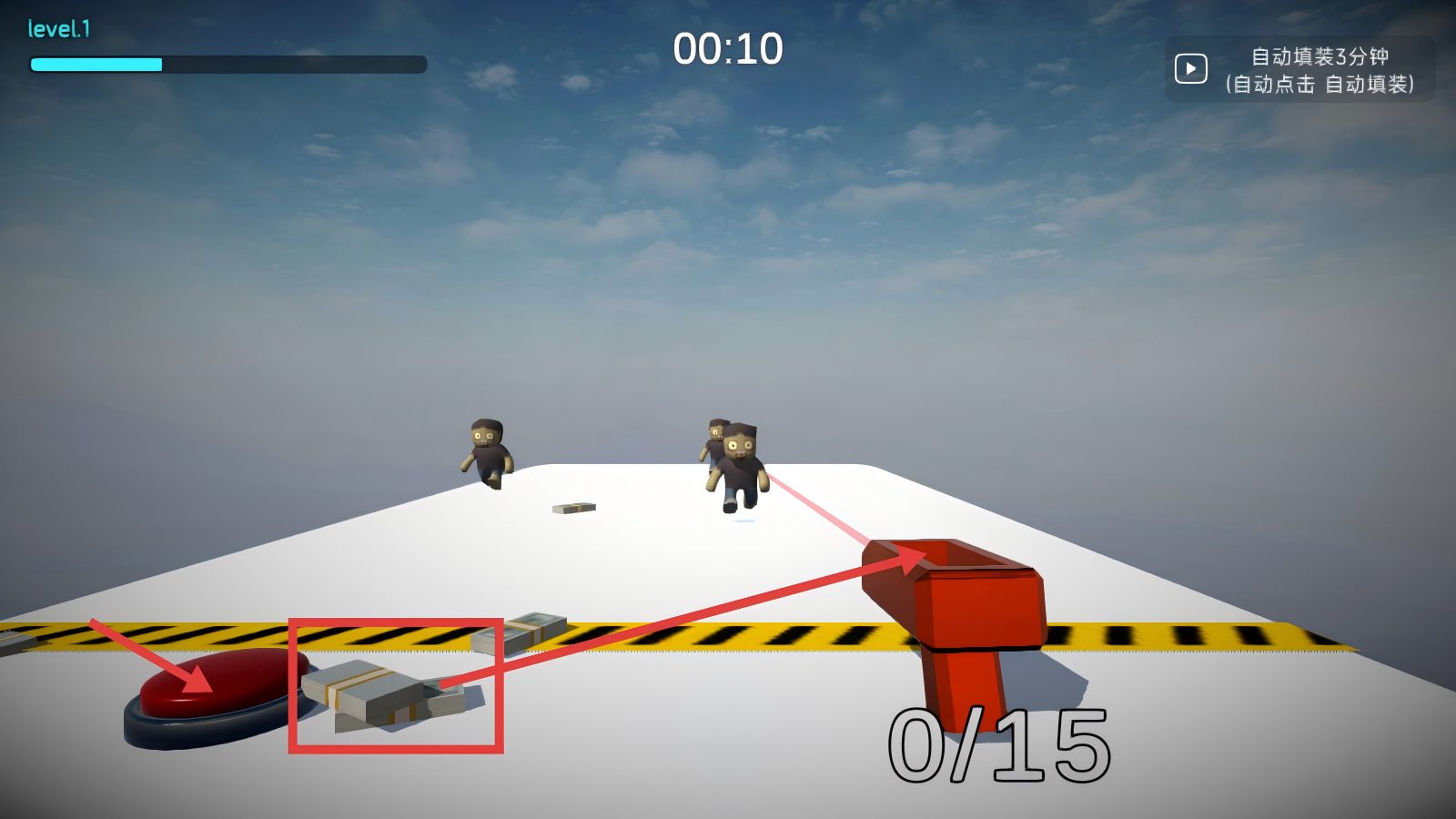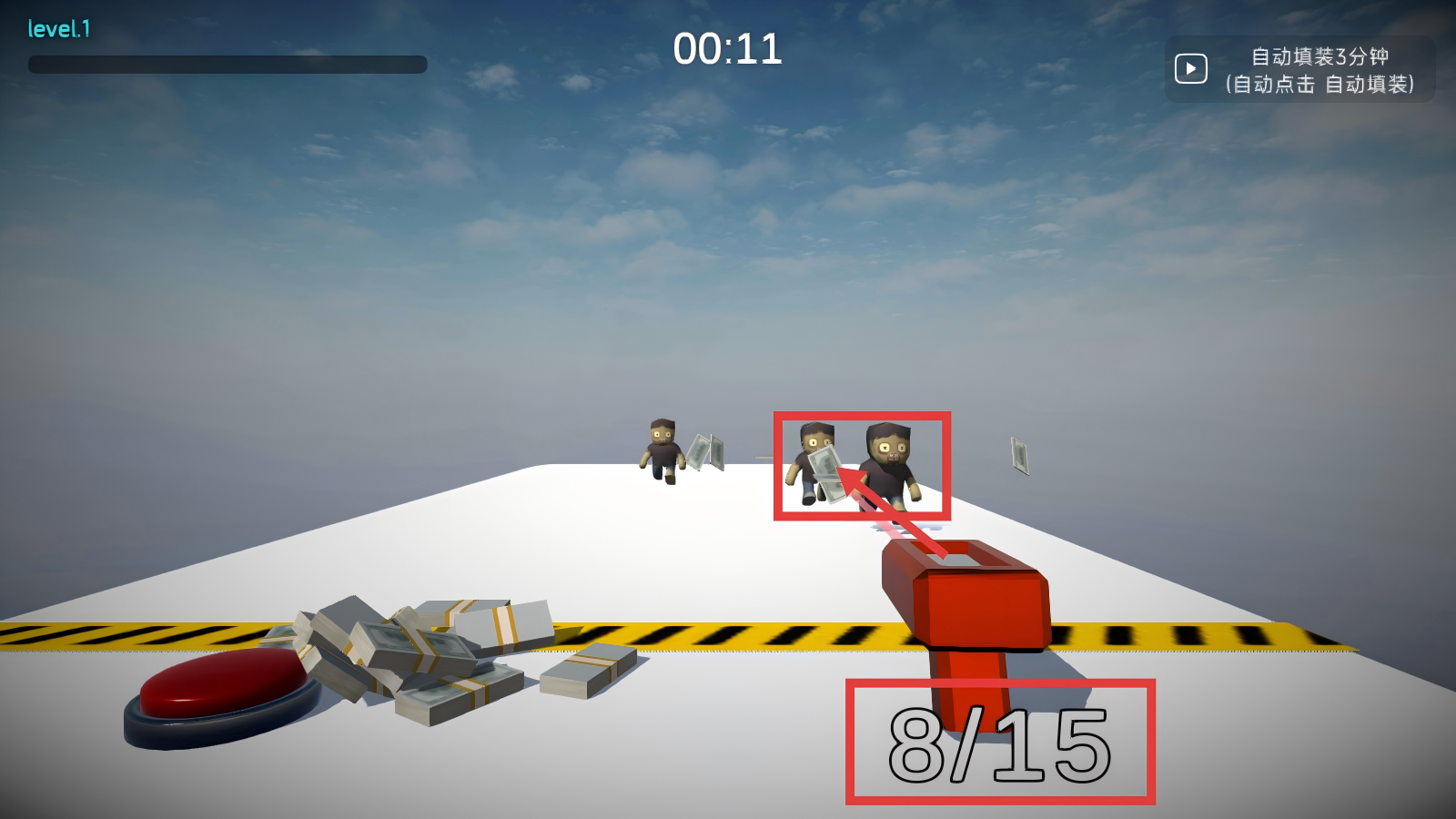 2、在level.1场景下,点击红色按钮,利用旁边的钱,通过红色装置将钱投向僵尸,开启拦截行动。