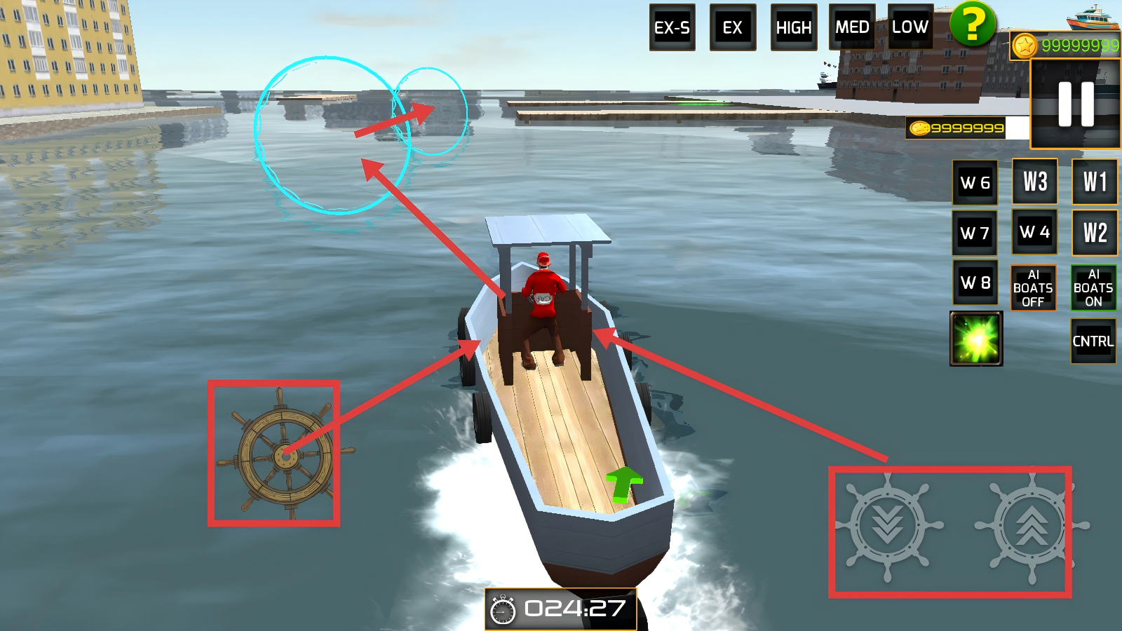 2、驾驶小船时,通过方向舵和加速-减速按钮操控船只,朝着蓝色传送圈方向移动。