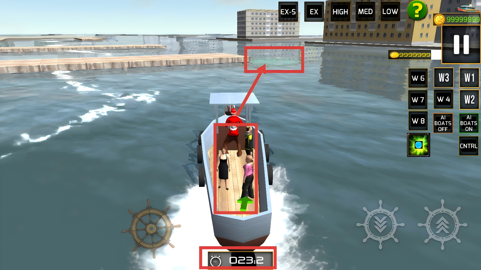 3、船上搭载乘客后,留意下方剩余时间,朝着标注的目标区域行驶,完成运输任务。