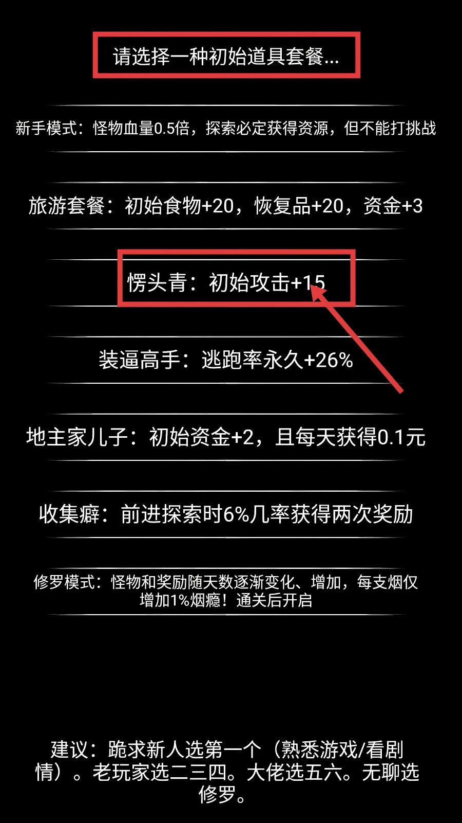 1、选择【愣头青】初始道具套餐,能让初始攻击+15,增强前期战斗能力,助力荒野冒险。